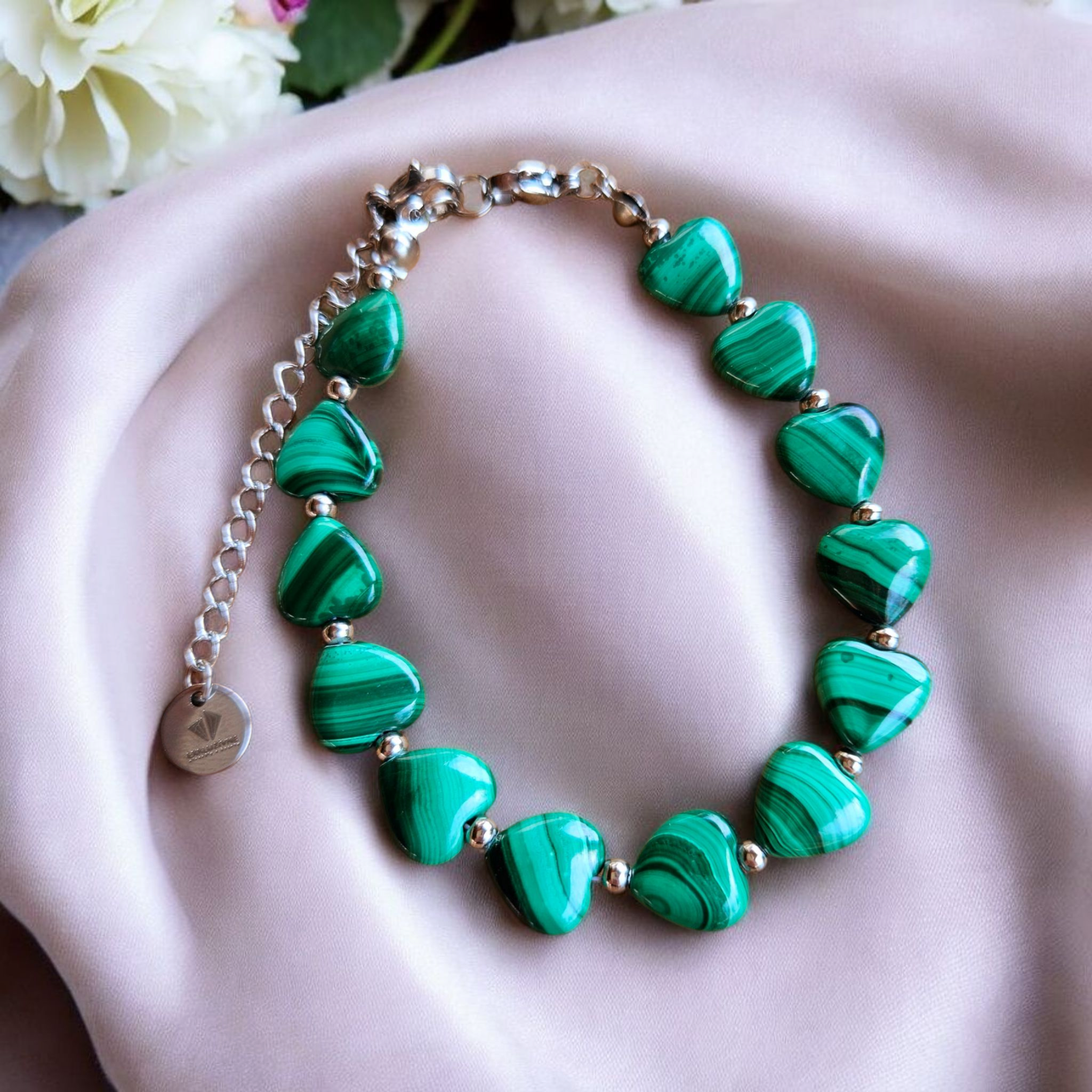 Malachit náramok srdiečka so zapínaním z chir.ocele
