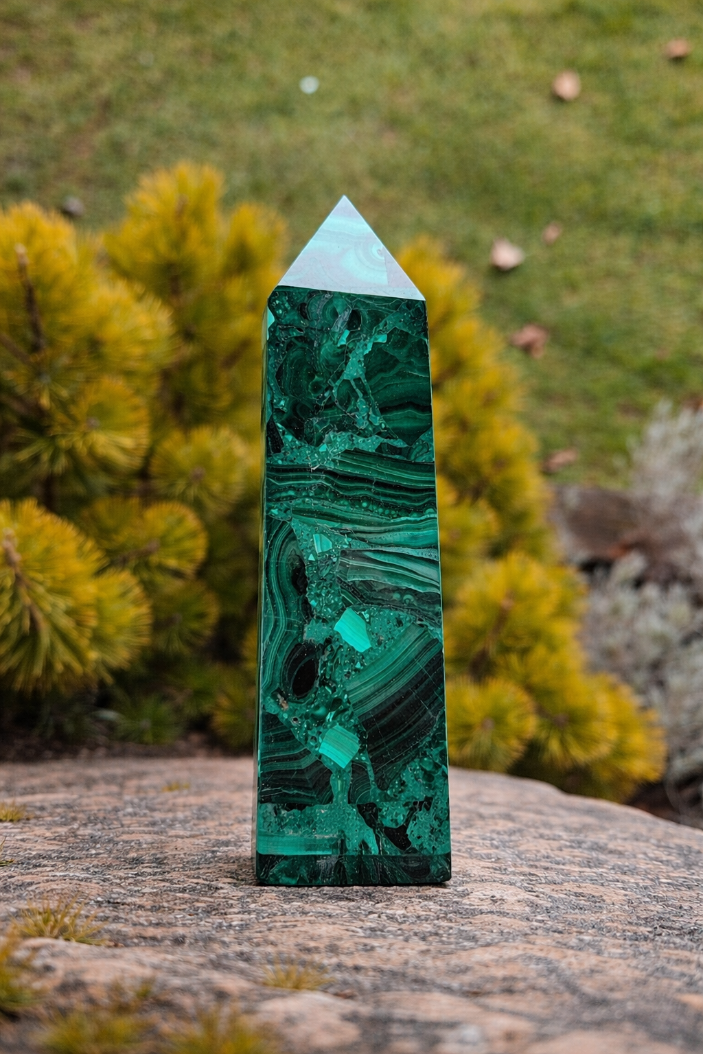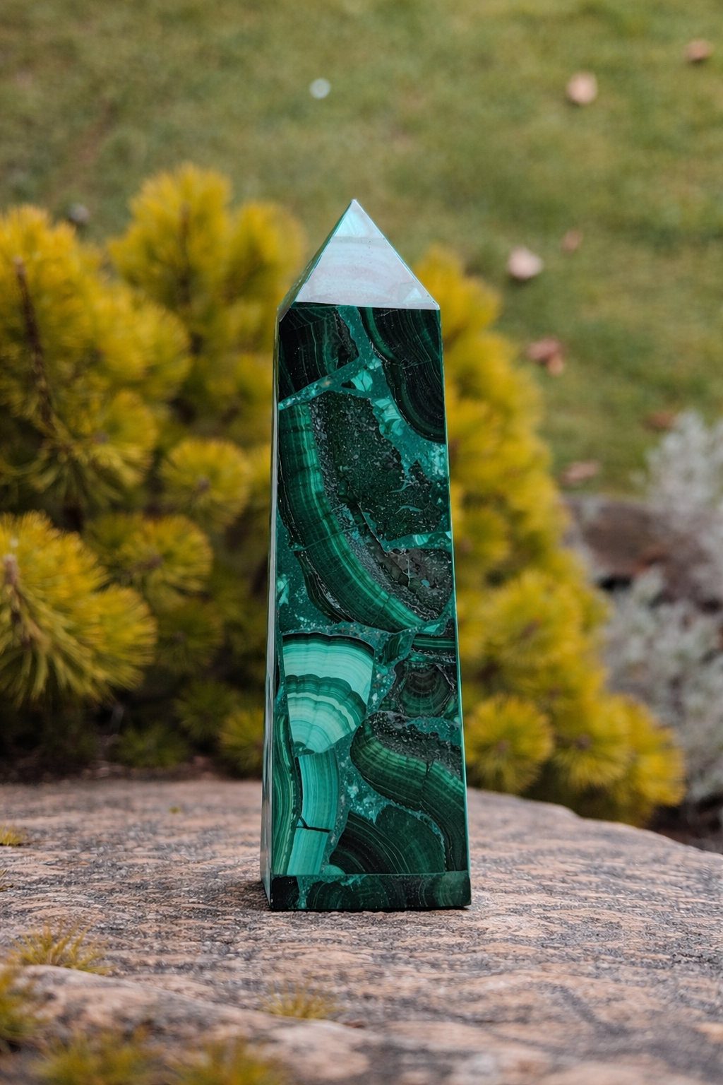 Nádherný leštený malachit opracovaný do tvaru obelisku, ktorý zaujme svojimi typickými sýtozelenými pásmi a prirodzenou kresbou. Každý kus je jedinečný originál vytvorený samotnou prírodou.
