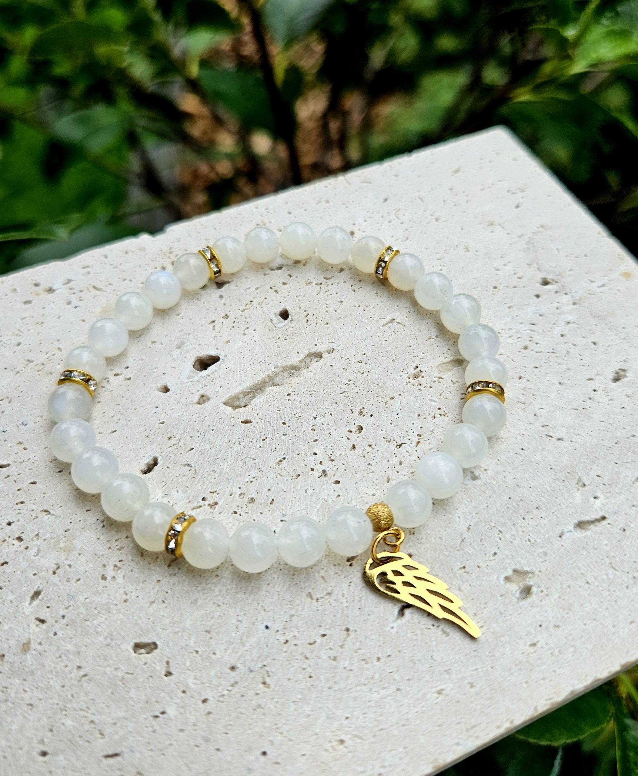 Mesačný kameň – Adulár náramok 6mm zlatý Anjelské krídlo