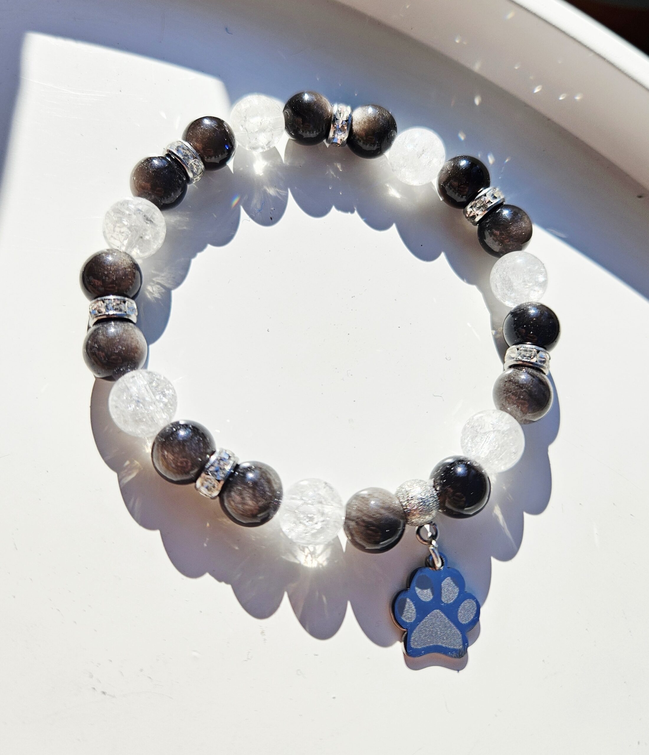 Náramok zo strieborného obsidiánu a krištáľu s príveskom labky