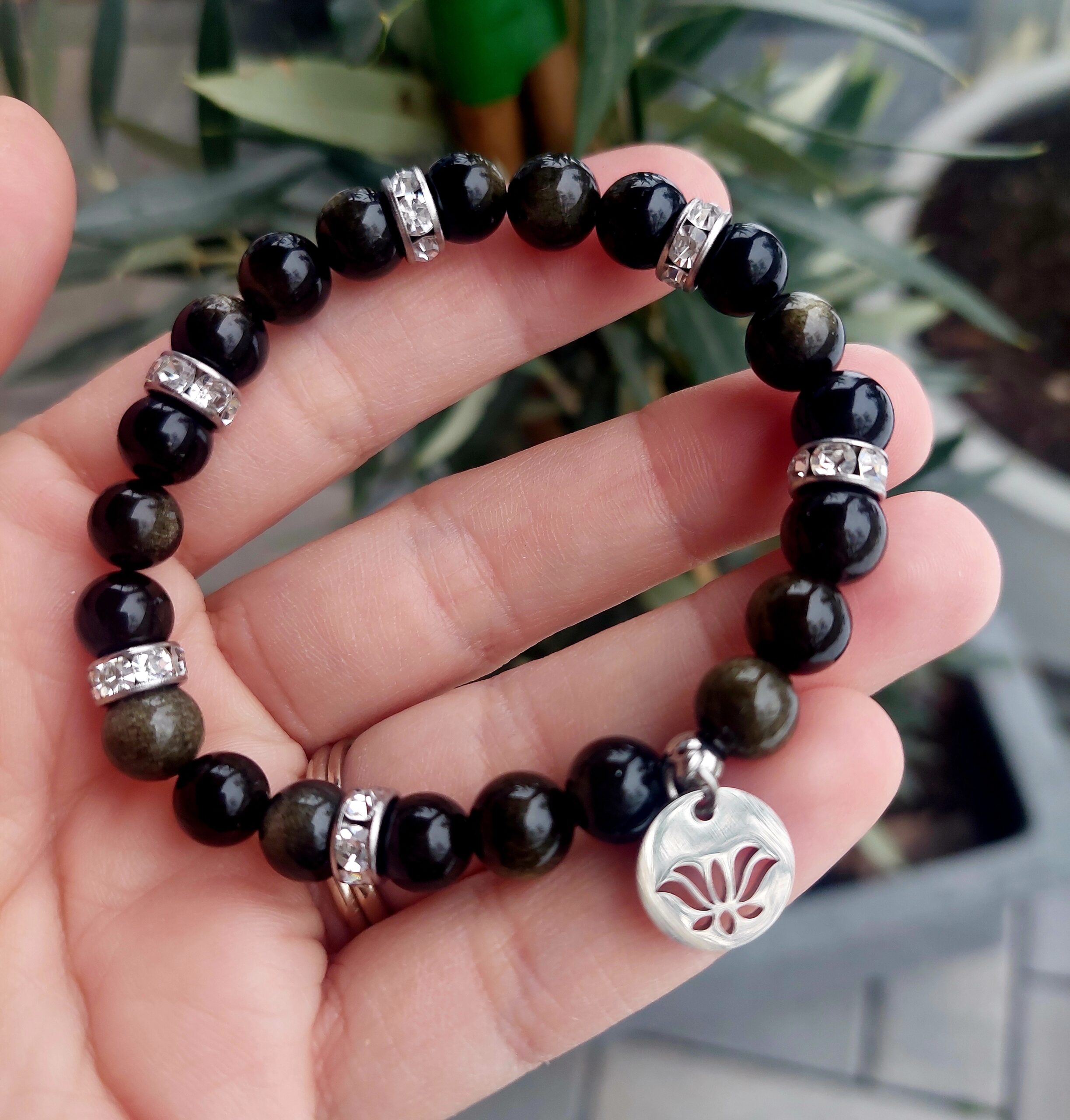 Obsidián zlatý náramok 8mm Lotos