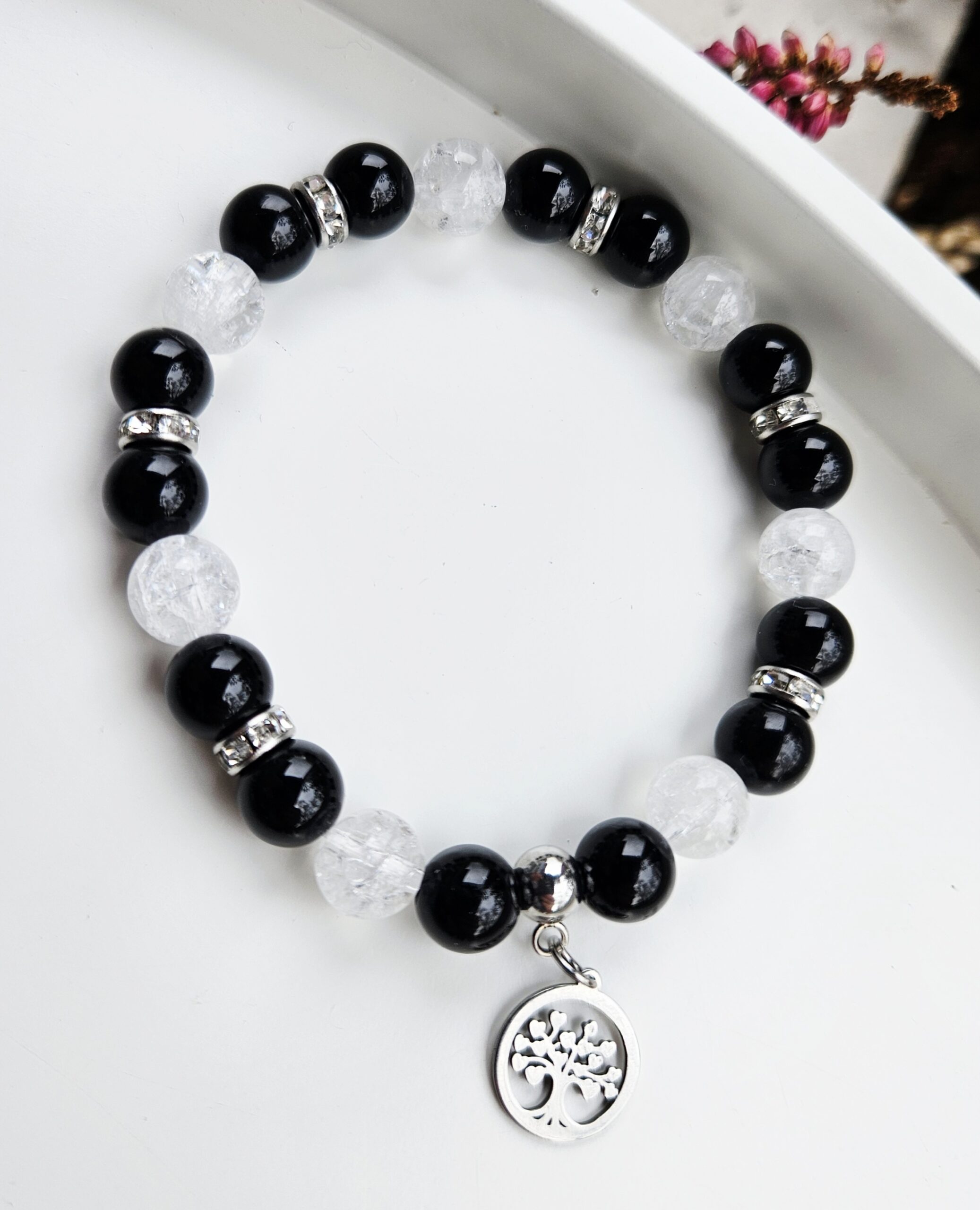 Ónyx čierny lesklý + Krištáľ náramok 8mm Strom života