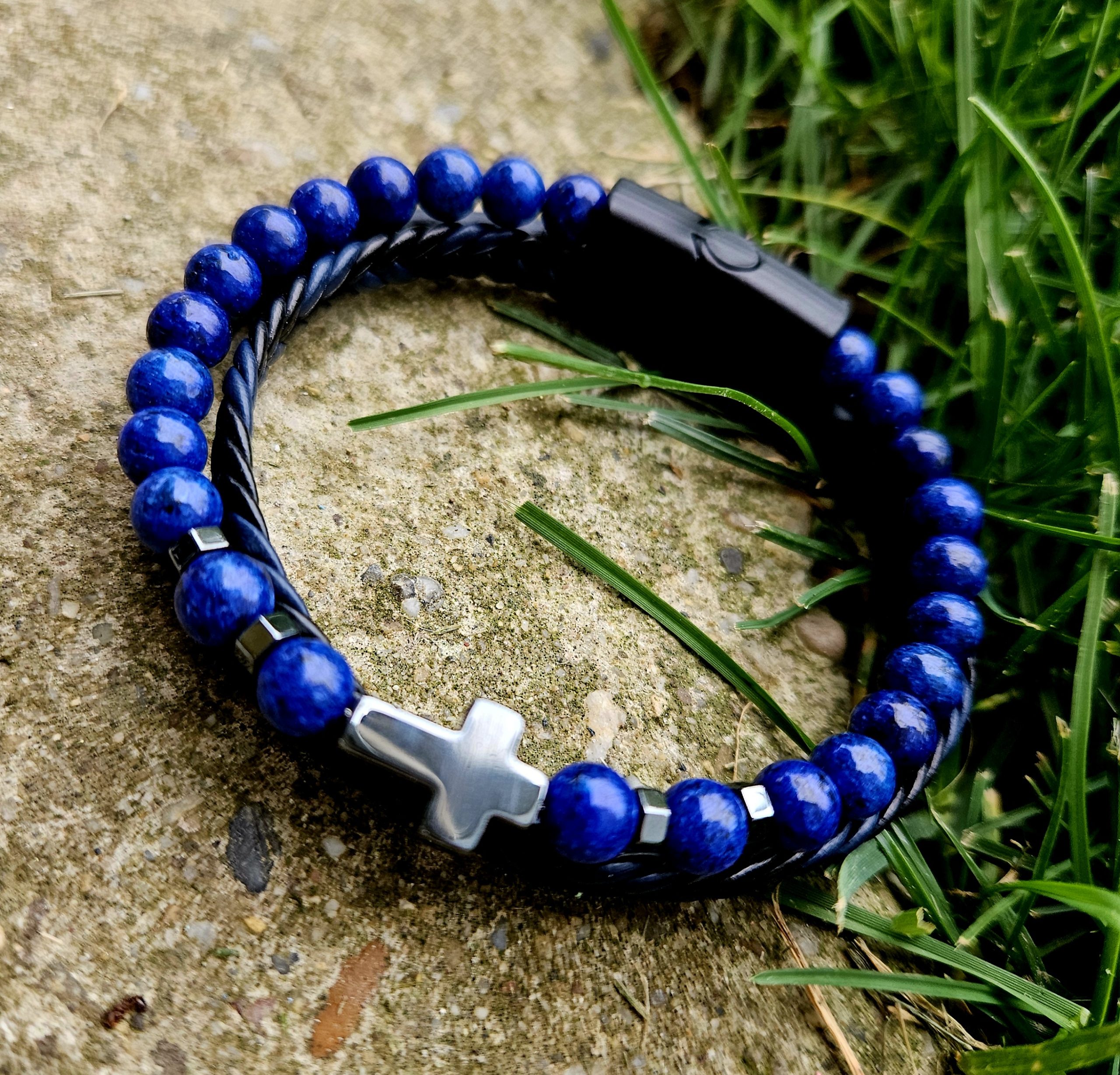 Pánsky náramok LAPIS LAZULI + koženka 20cm