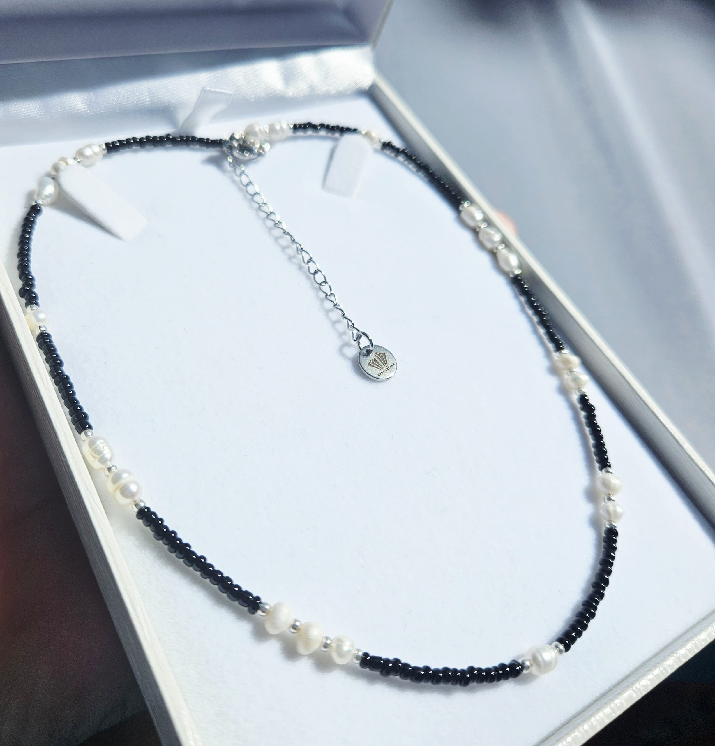 Perly riečne biele + čierne korálky náhrdelník