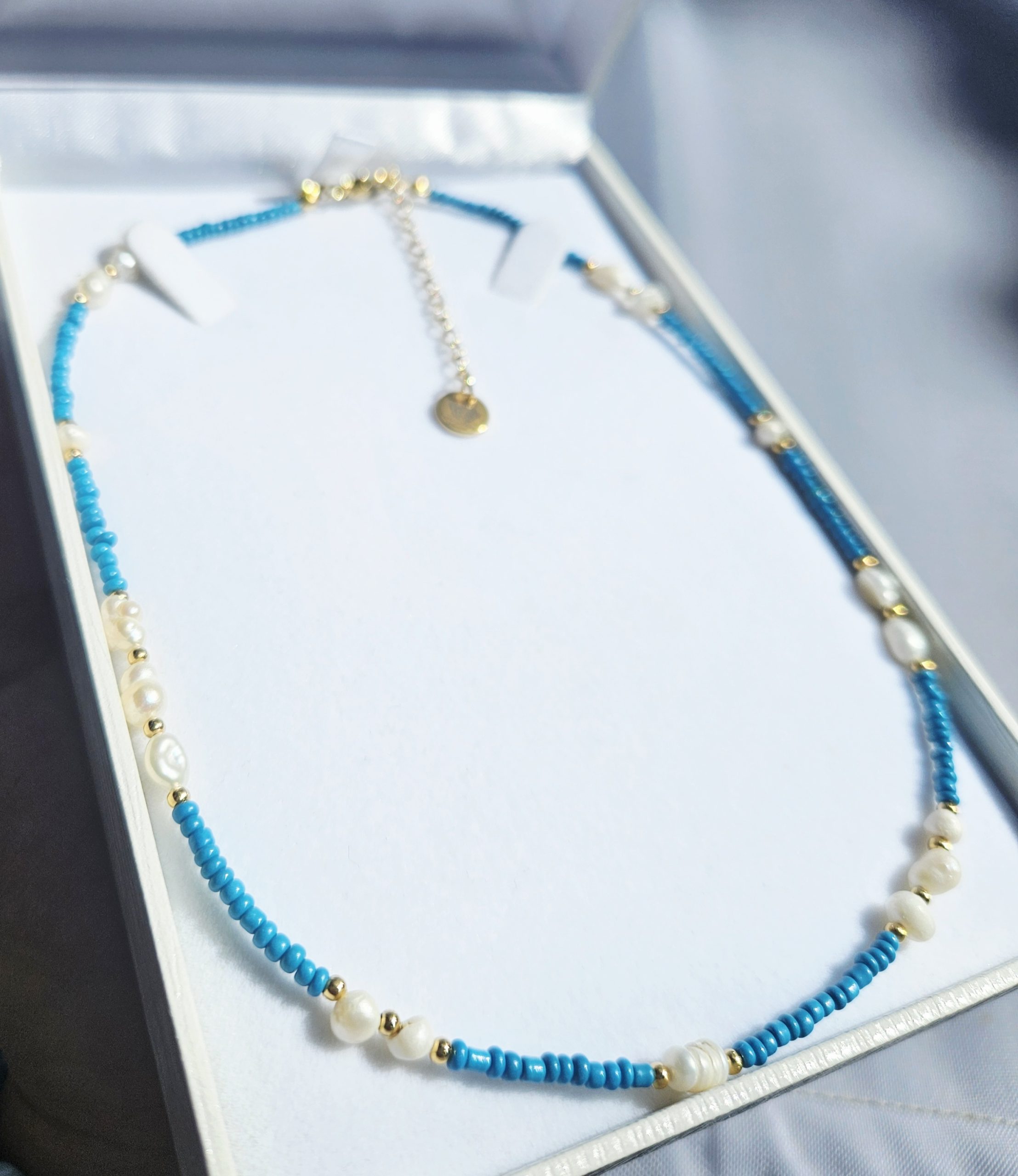 Perly riečne biele + tyrkysové korálky náhrdelník
