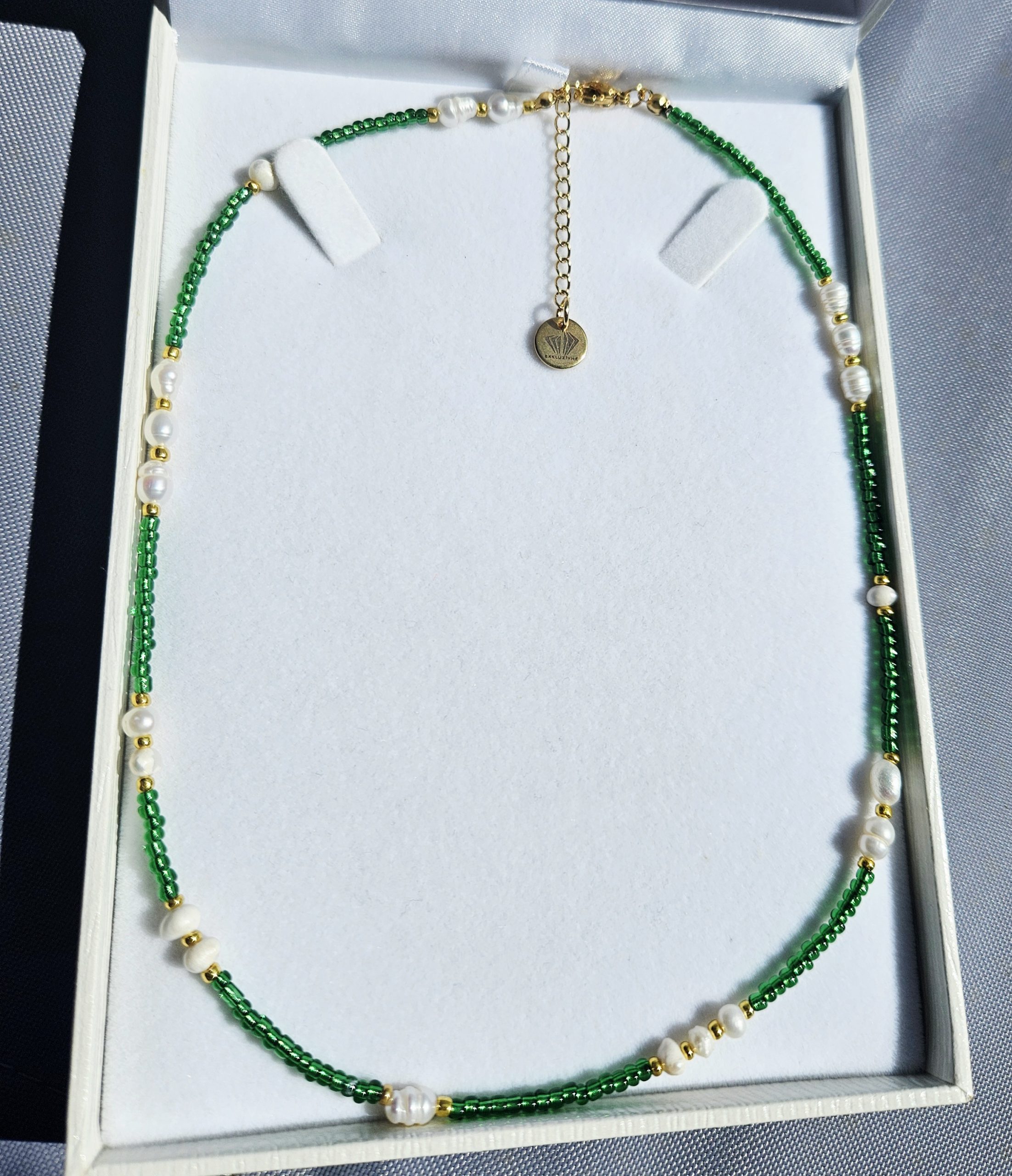 Perly riečne biele + zelené korálky náhrdelník