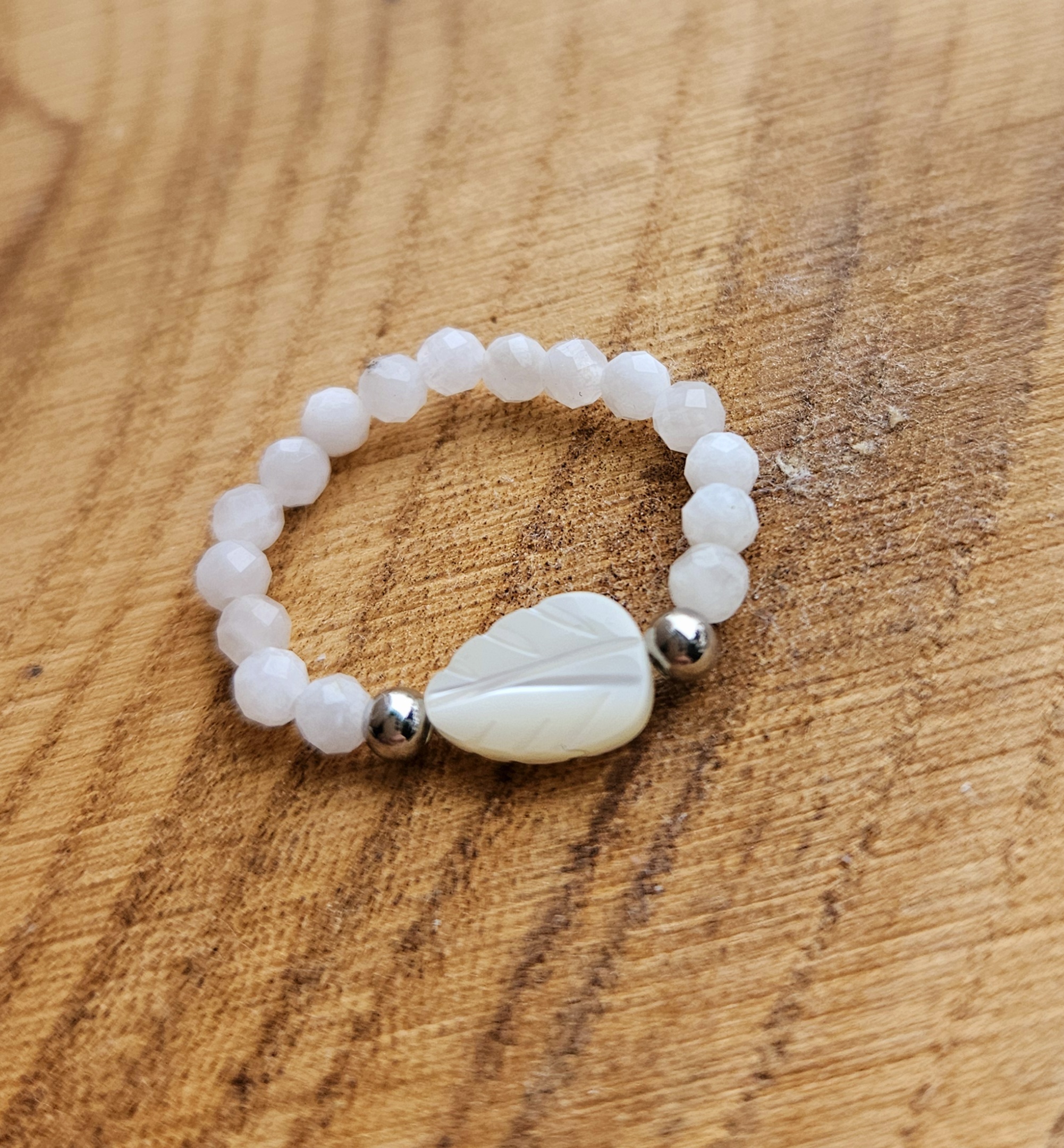 Prsteň na gumičke Mesačný kameň-Adulár+ Perleť lístok strieborný