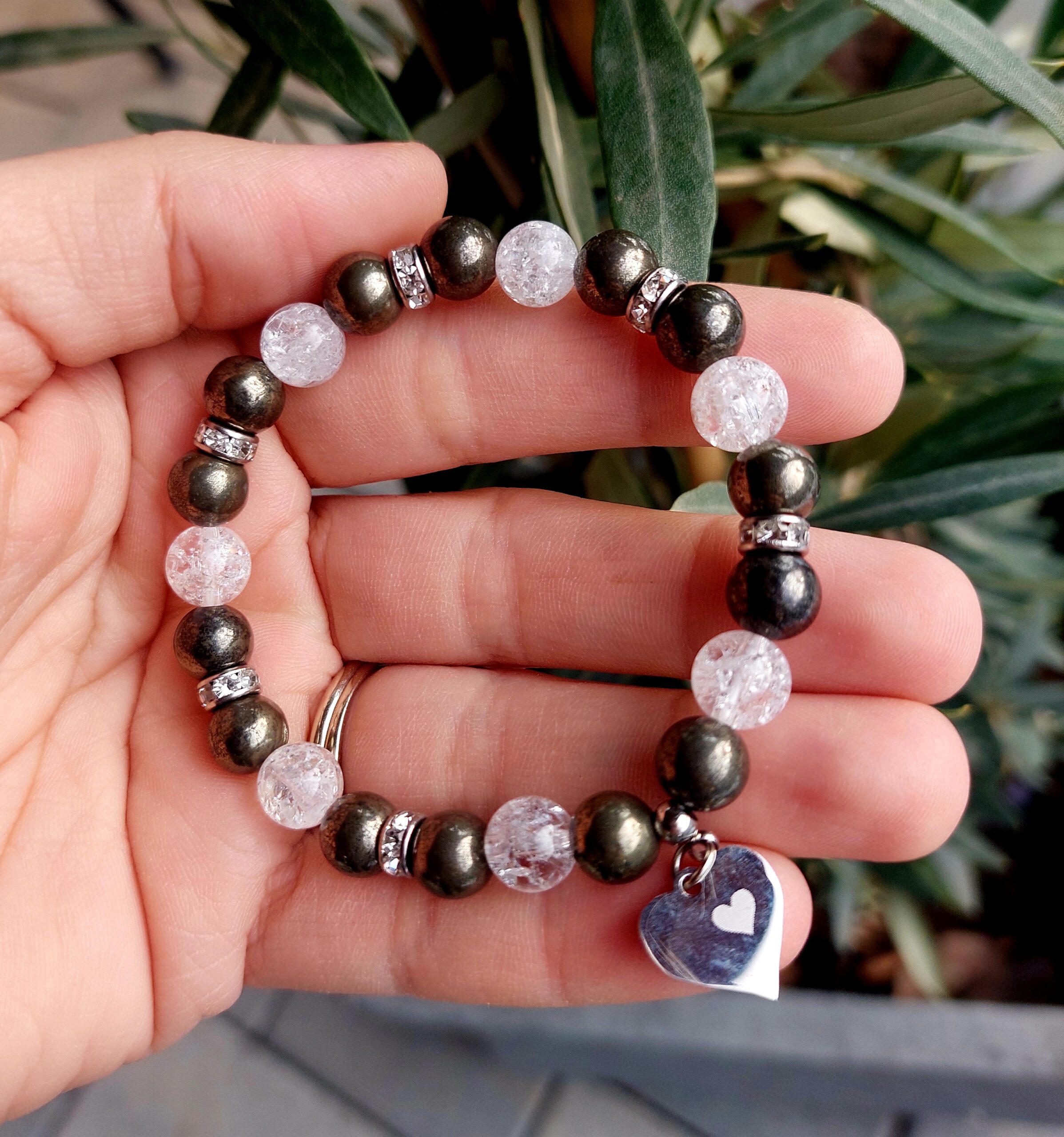 Pyrit + Krištáľ náramok 8mm Srdiečko