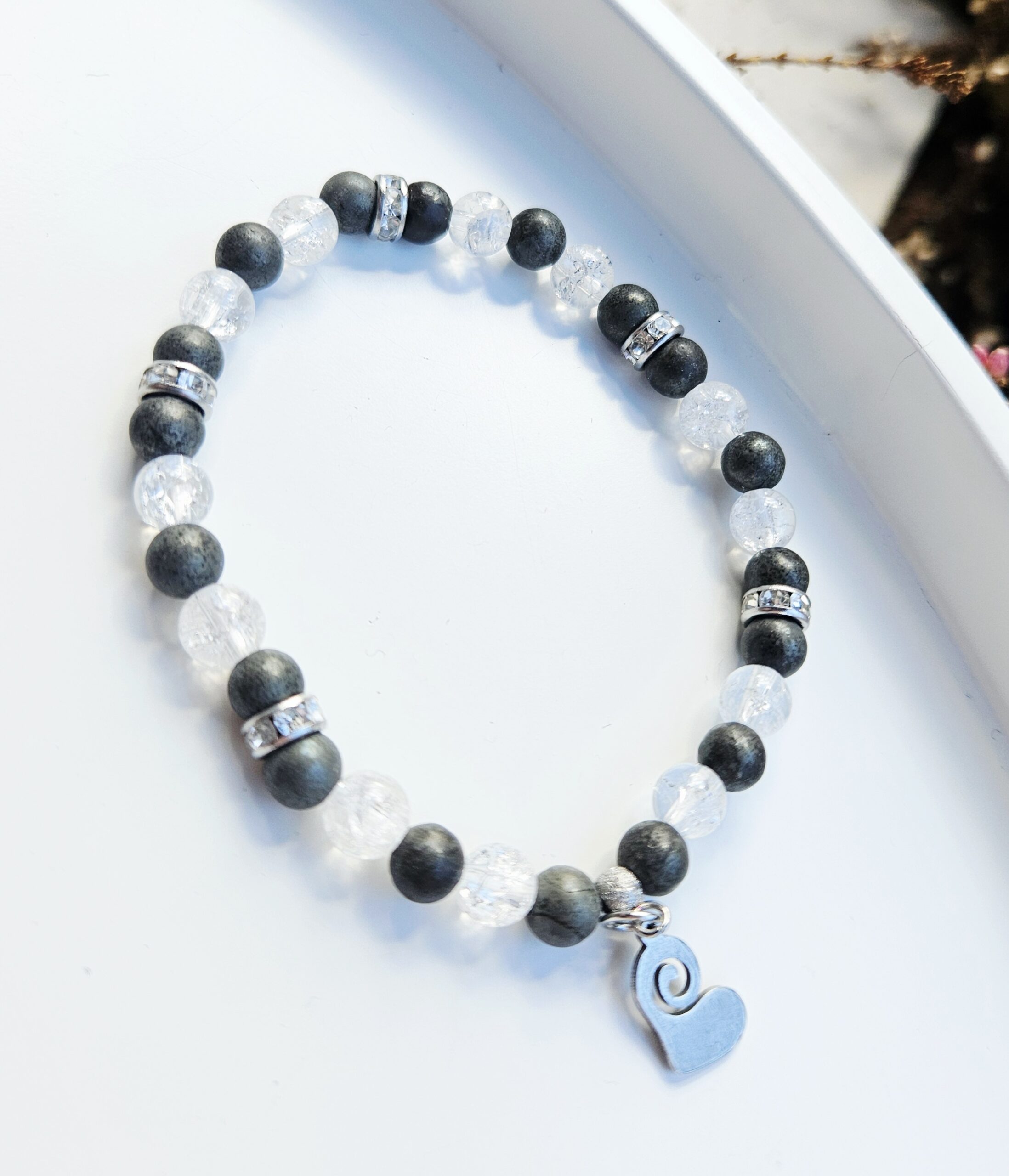 Náramok dopĺňajú prvky z chirurgickej ocele a jemný prívesok srdiečka, symbol lásky, radosti a pozitívnej energie.