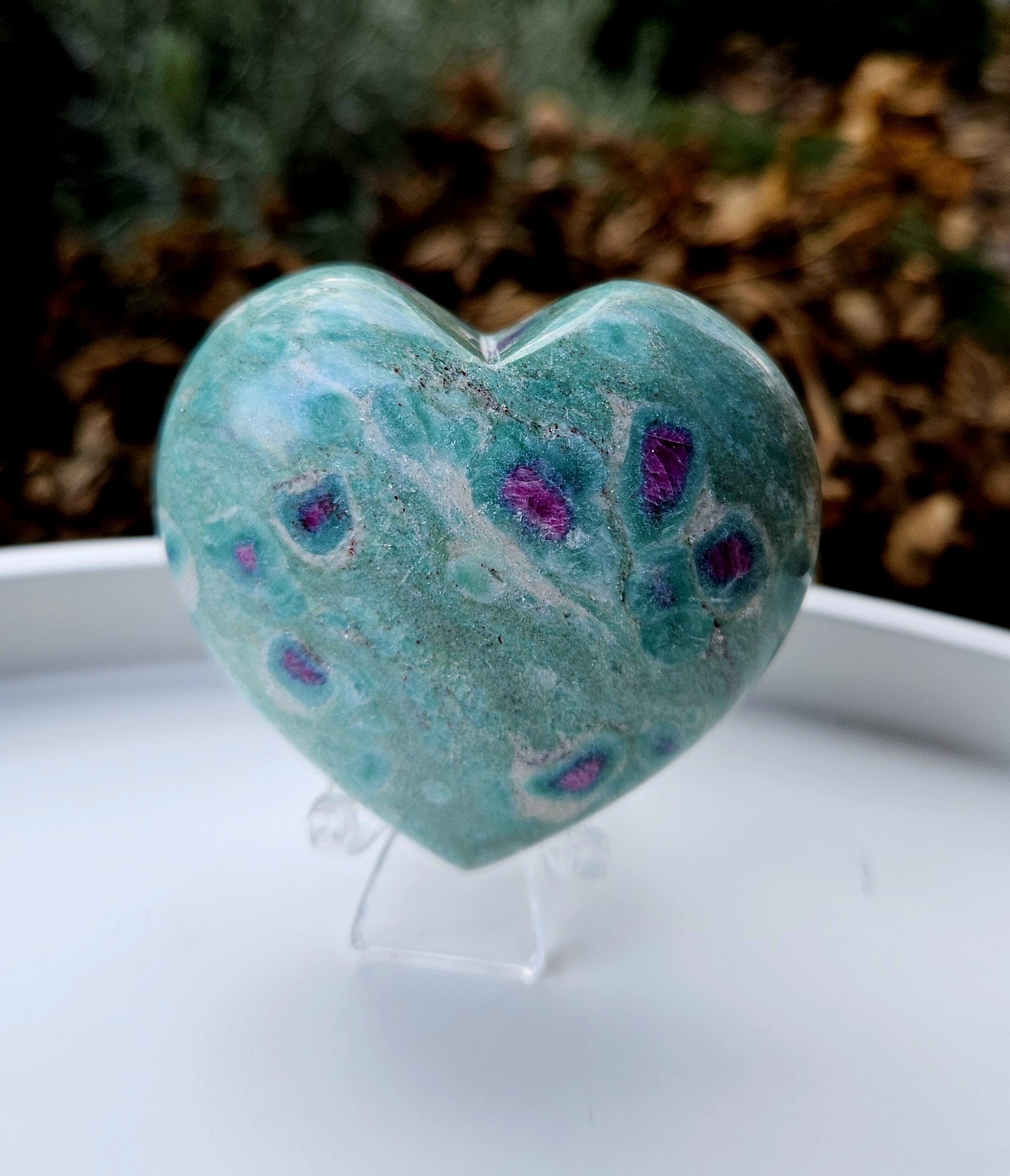 Rubín v zoisite je považovaný za kameň vitality, sily a radosti zo života. Spája energiu srdca s vnútornou stabilitou, podporuje motiváciu, tvorivosť a harmonizuje emócie. V tvare srdca symbolizuje lásku, vášeň a životnú energiu.