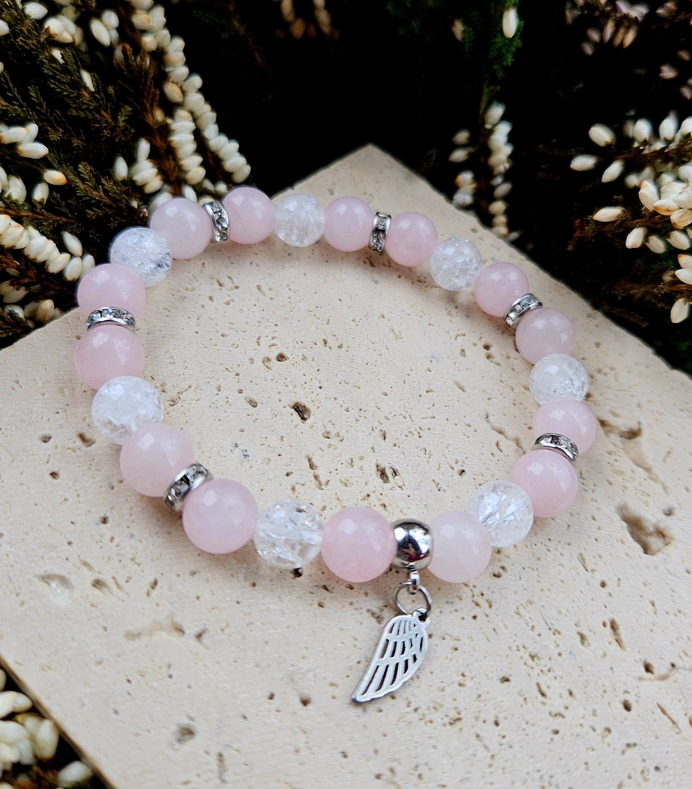Ruženín + Krištáľ náramok 8mm ANJELSKÉ KRÍDLO