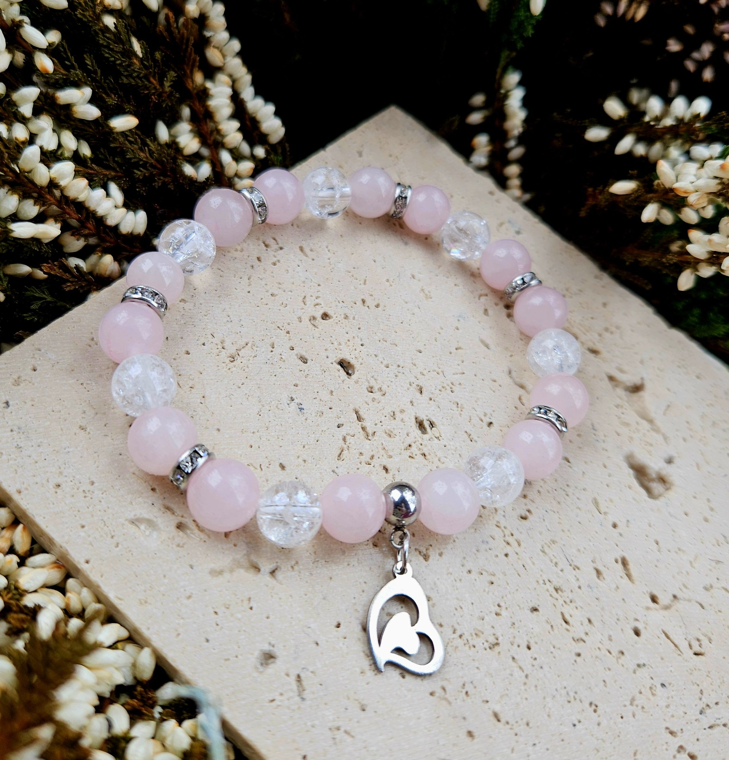 Ruženín + Krištáľ náramok 8mm SRDIEČKO