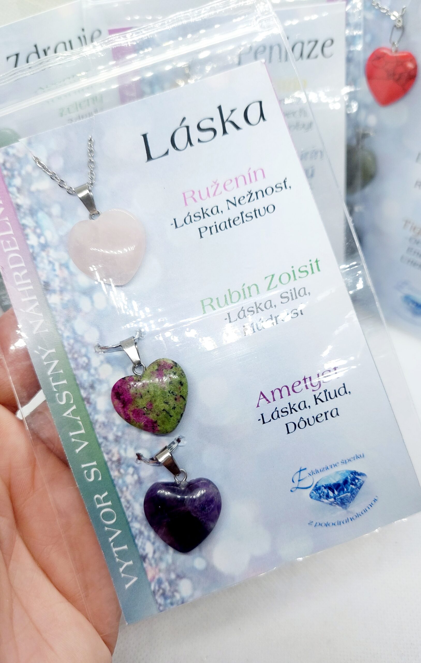 Ruženín, Rubín zoisit, Ametyst – prívesky. Tvar –  srdce. Rozmer – 2cm.  Kov –  chirurgická oceľ, retiazka – chirurgická oceľ