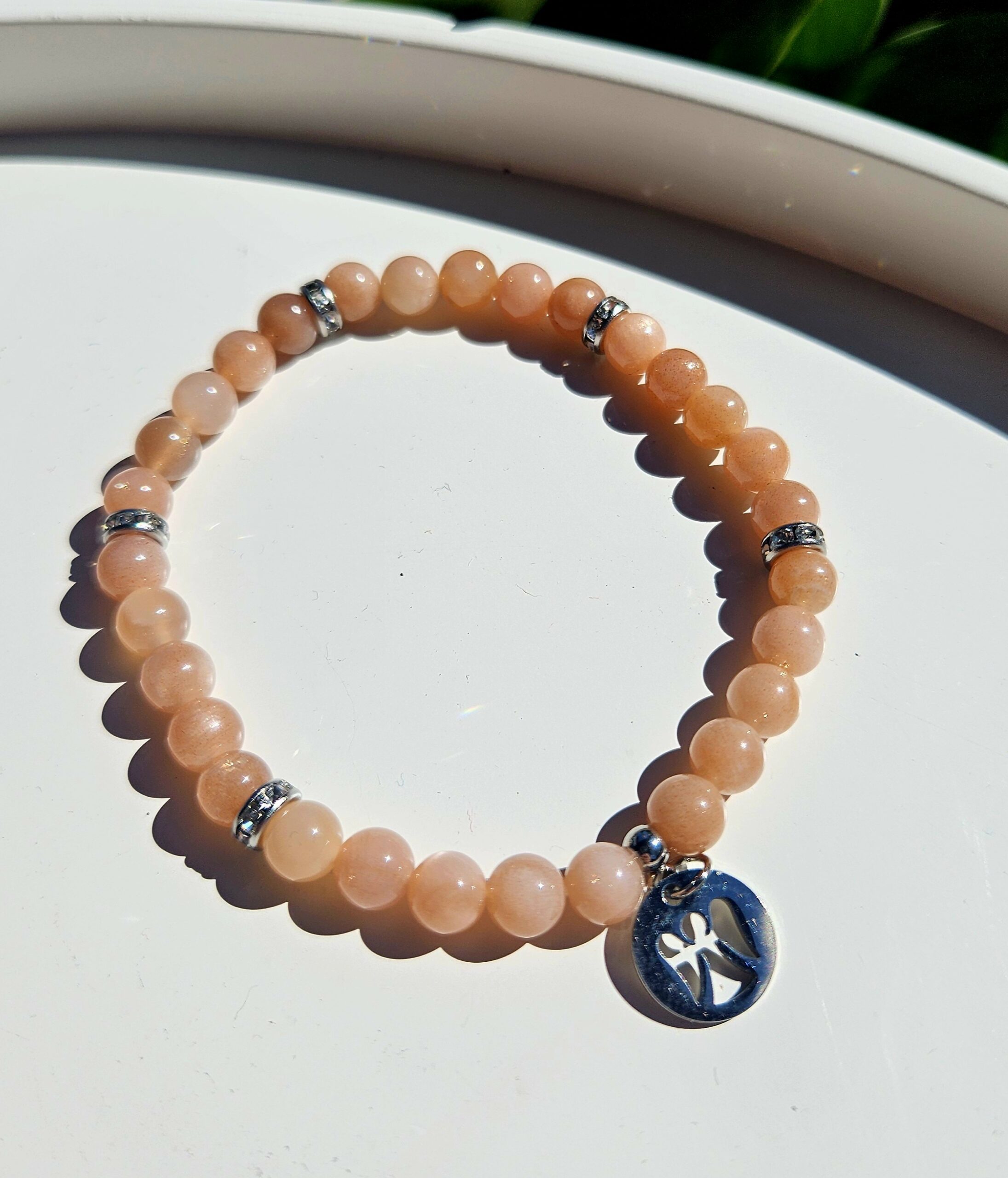 Nežný náramok zo slnečného kameňa s drobnými 6 mm guľôčkami pôsobí elegantne a ľahko na zápästí. Teplé broskyňové odtiene dopĺňajú lesklé prvky z chirurgickej ocele a prívesok anjela, symbol ochrany a pokoja. Ideálny šperk pre každodenné nosenie aj ako milý darček.