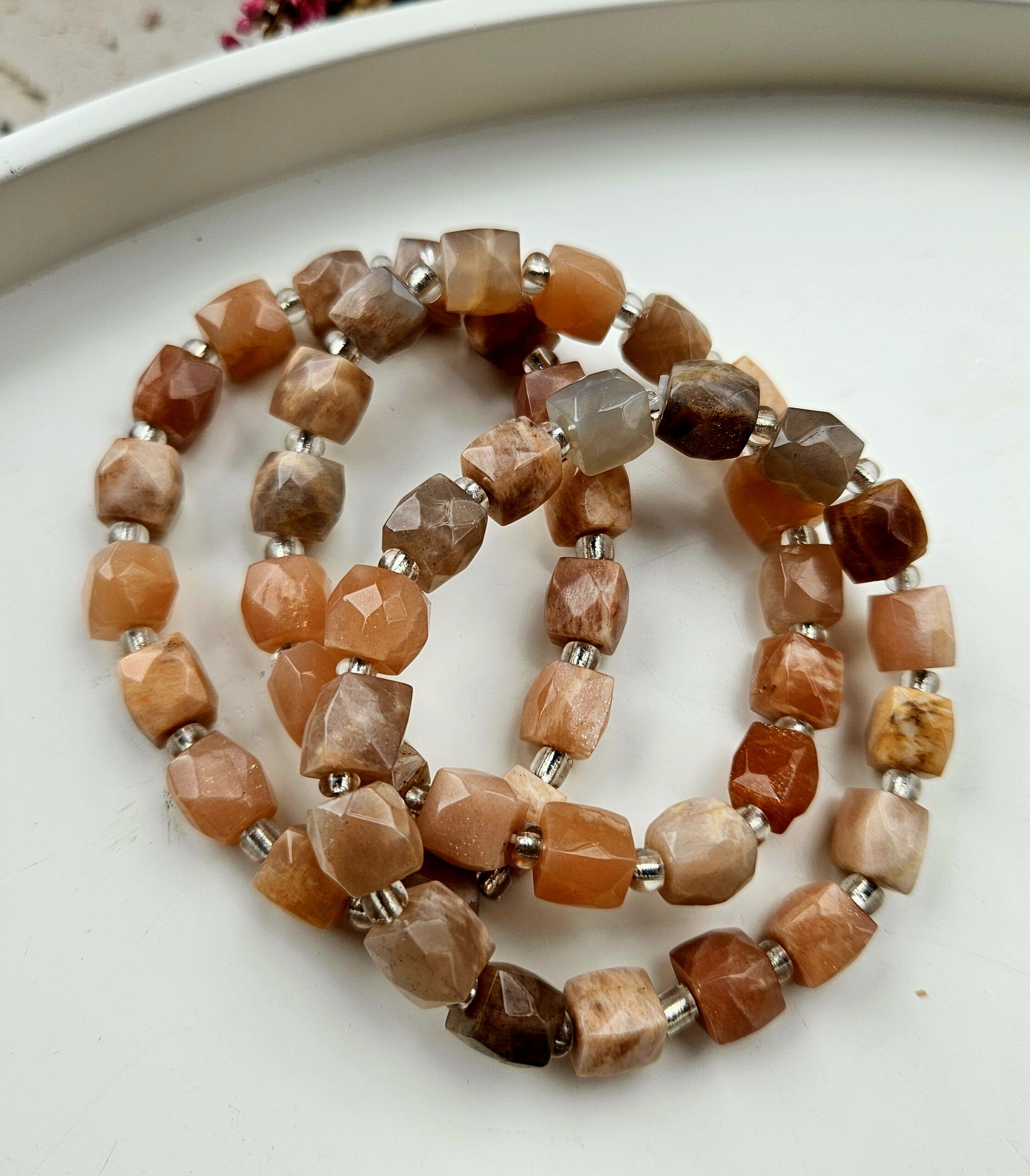 Elegantný náramok z prírodného slnečného kameňa vytvorený z fazetovaných kociek, ktoré vynikajú jemným trblietavým efektom a teplými odtieňmi broskyňovej, medovej a oranžovej farby. Každý kameň je originálny a pri dopade svetla odhaľuje typický iskriaci efekt – tzv. aventurescenciu, ktorá dodáva šperku žiarivý a luxusný vzhľad.