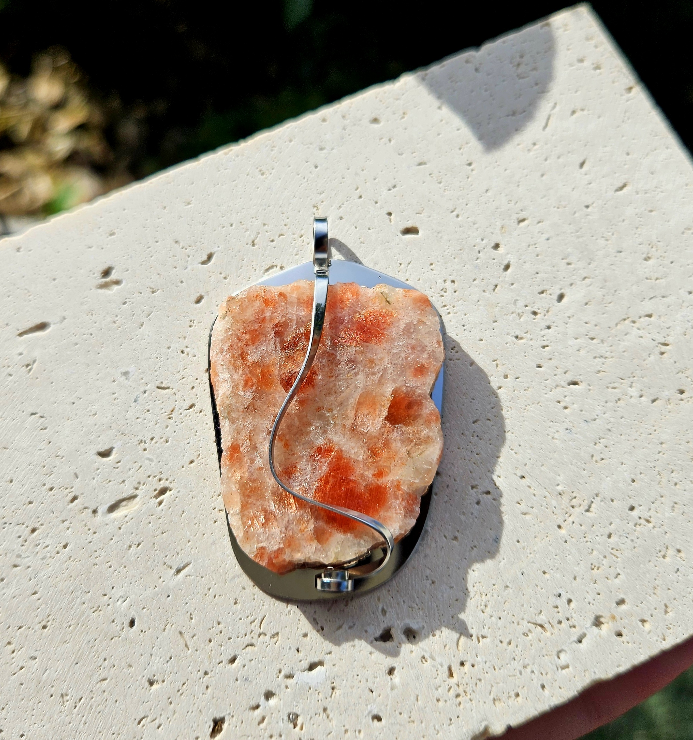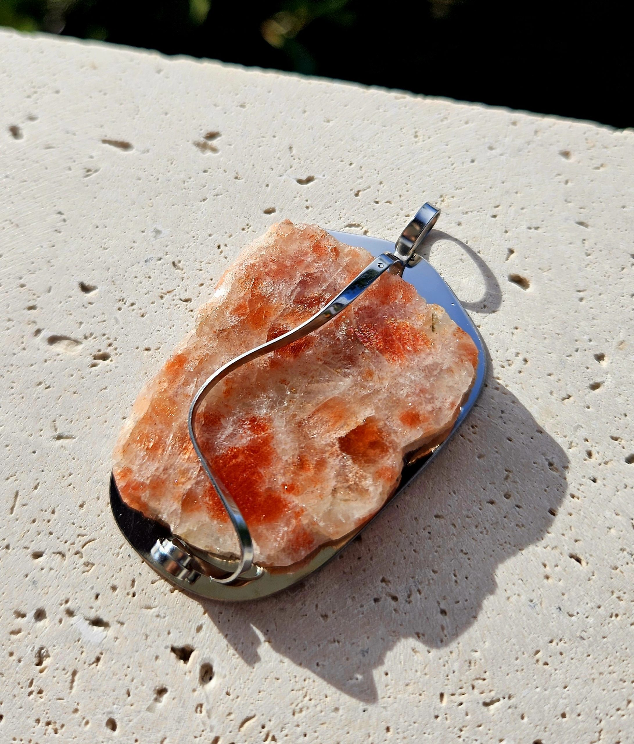 Slnečný kameň (surový) prívesok na platničke z chir.ocele