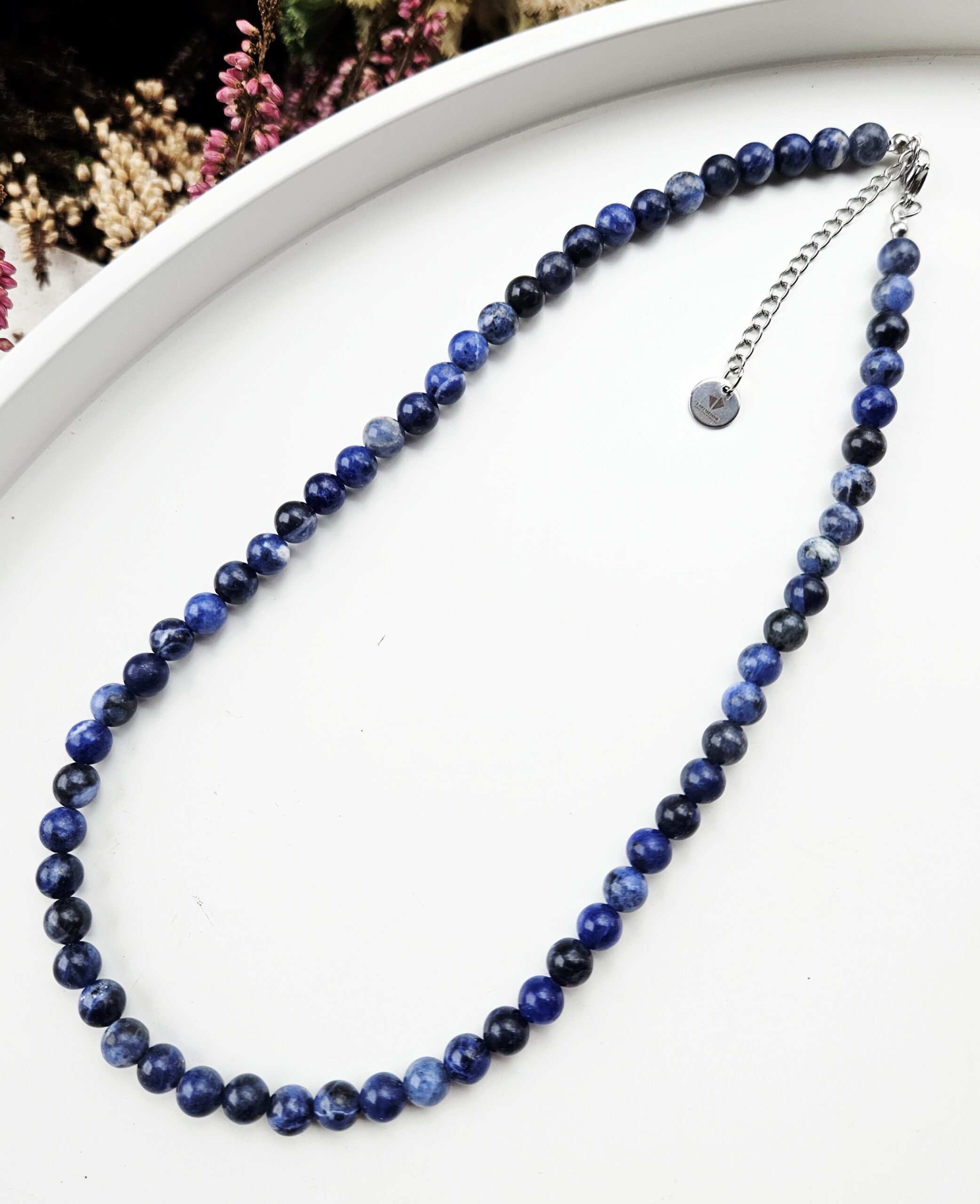 Elegantný náhrdelník zo sodalitu vyniká hlbokými odtieňmi modrej farby, ktoré dopĺňajú jemné prirodzené kresby každého kamienka. Sodalit je kameň pokoja, sebadôvery a jasného myslenia – podporuje koncentráciu, vnútornú harmóniu a pomáha vyjadriť vlastné myšlienky s istotou.