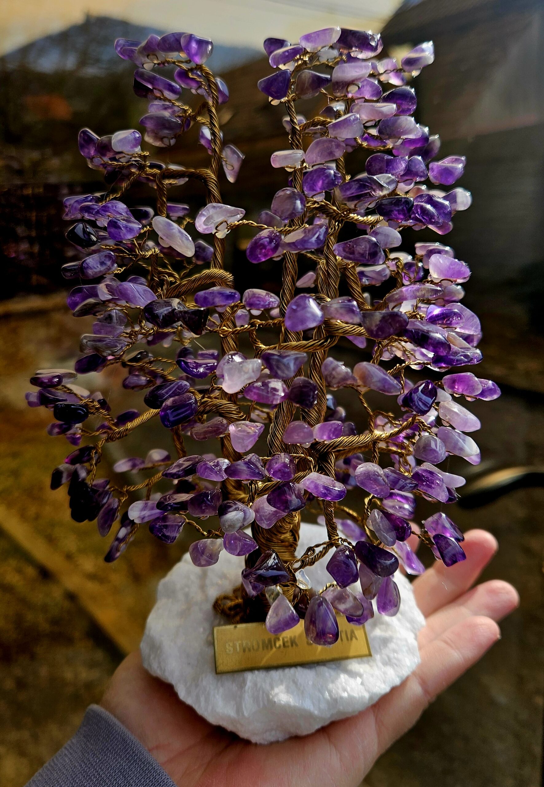 Ručne tvarovaný stromček šťastia z ametystu – kameňa pokoja, intuície a duchovnej rovnováhy. Každý kamienok je starostlivo upevnený na pevnej konštrukcii, ktorá vytvára bohatú a harmonickú korunu stromu.