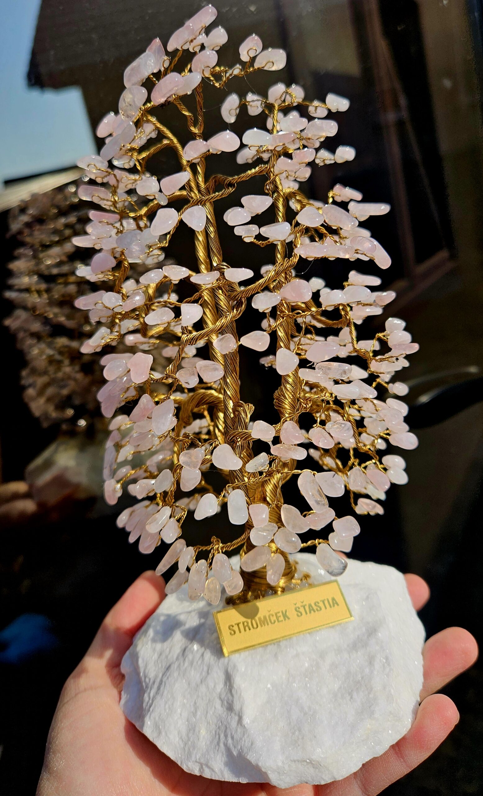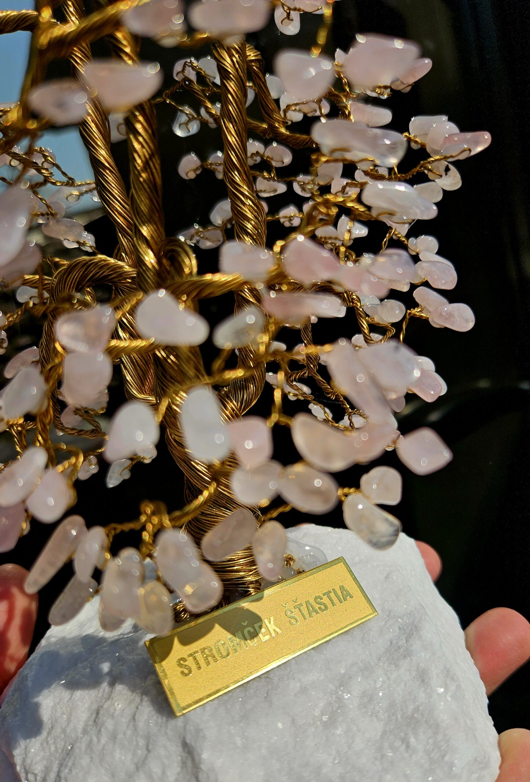 Ručne tvarovaný stromček šťastia z ruženínu – kameňa lásky, nežnosti a harmónie. Desiatky jemne ružových kamienkov vytvárajú bohatú korunu stromu, ktorá pôsobí elegantne a prináša do priestoru pokoj a príjemnú energiu.