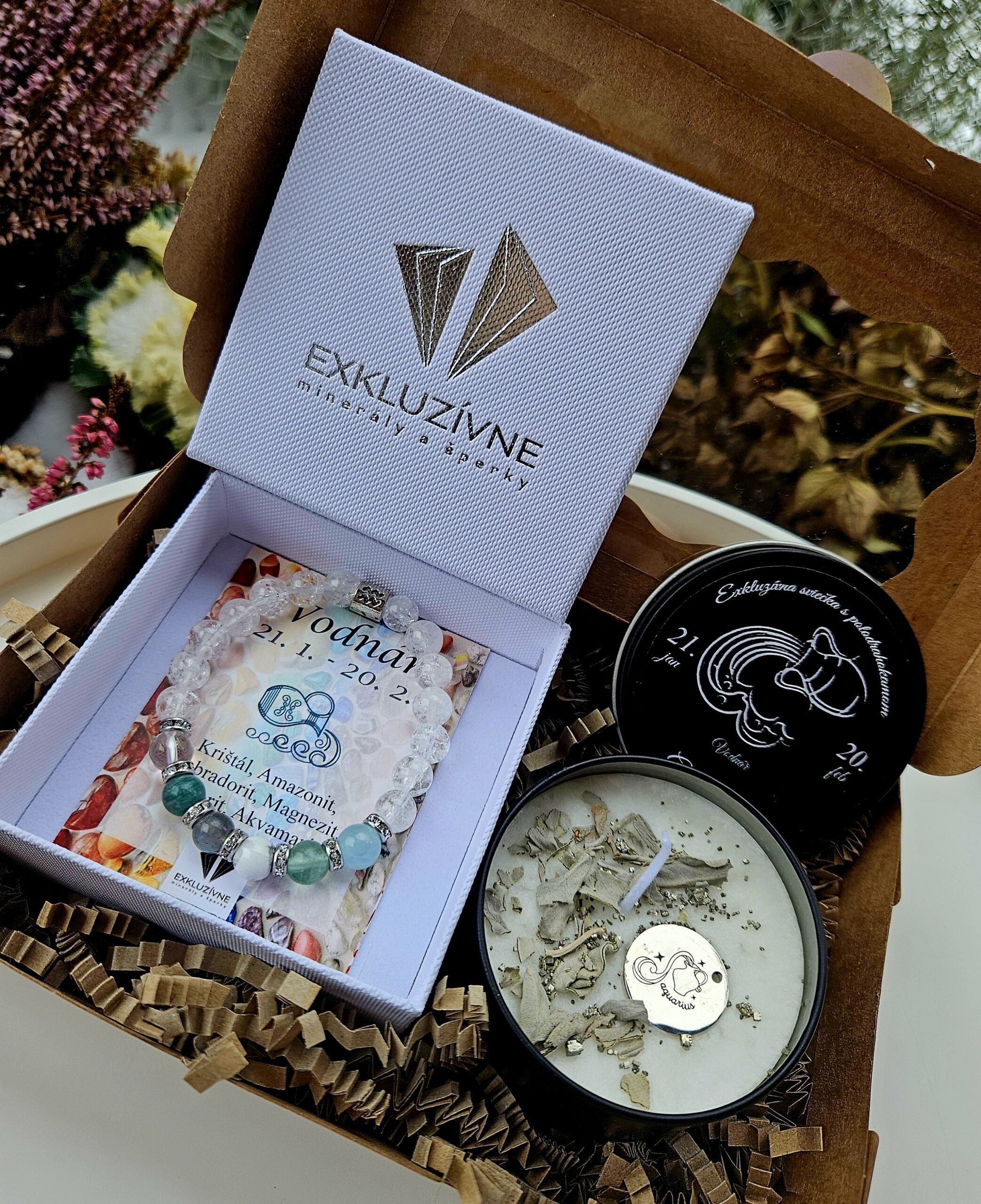 Sviečka + náramok znamenie VODNÁR v darčekovej krabičke