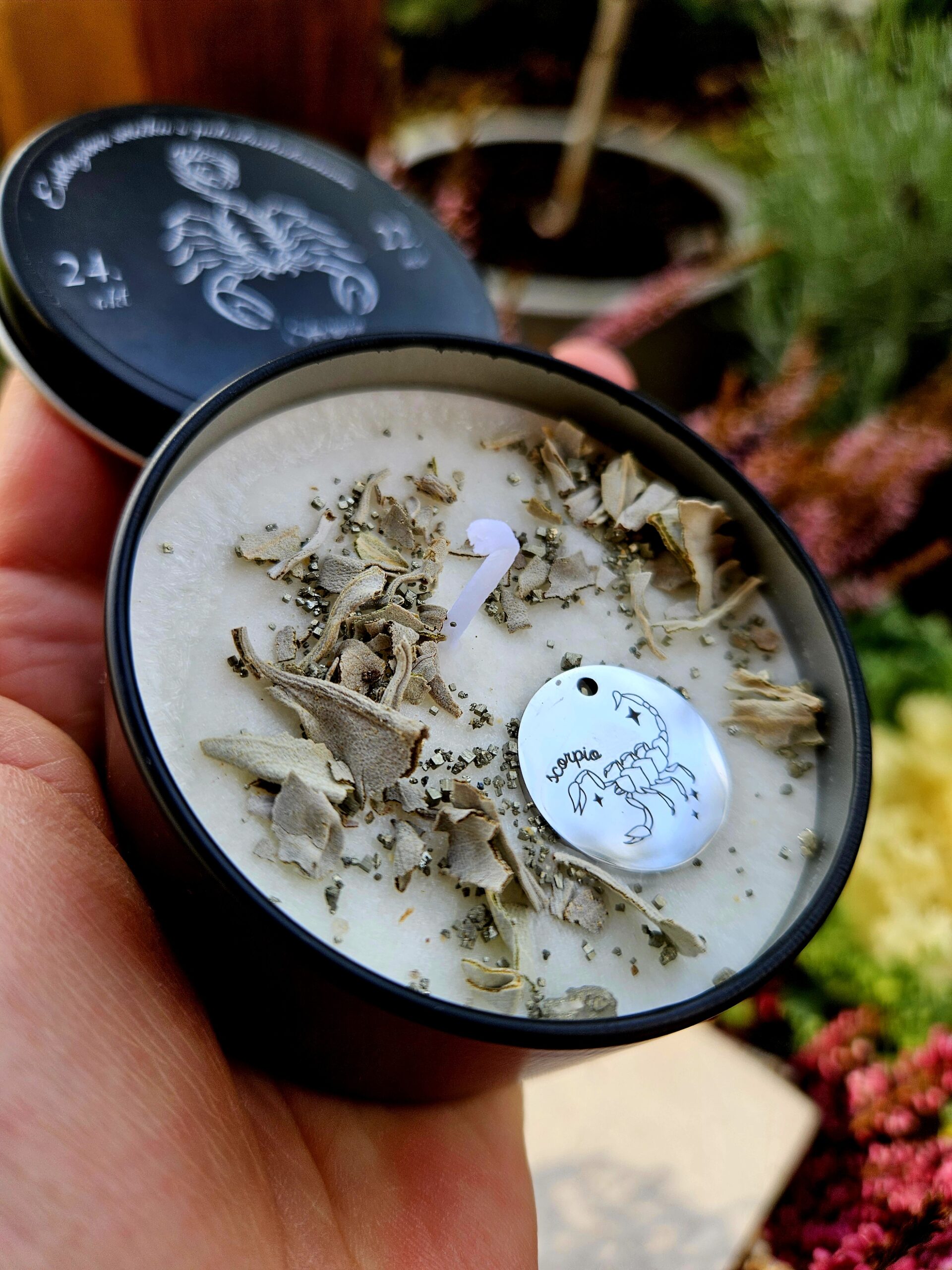 Sviečka očistná s bielou šalviou pre znamenie ŠKORPIÓN s oceľovým príveskom znamenia