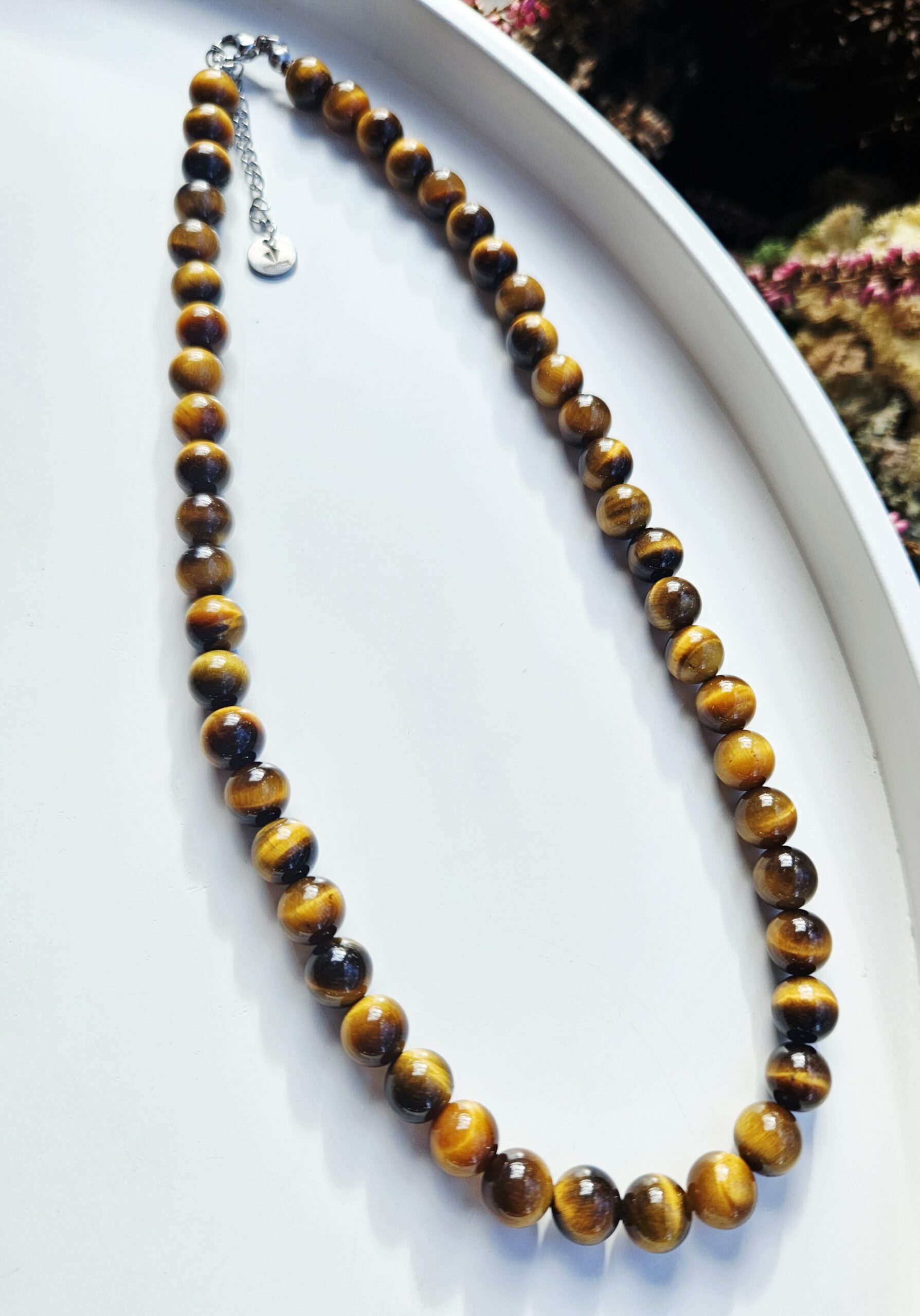 Nádherný náhrdelník z prírodného tigrieho oka v typických hnedo-zlatých odtieňoch. Tento minerál je známy svojím hodvábnym leskom a fascinujúcimi odleskami, ktoré sa pri pohybe na svetle jemne menia.