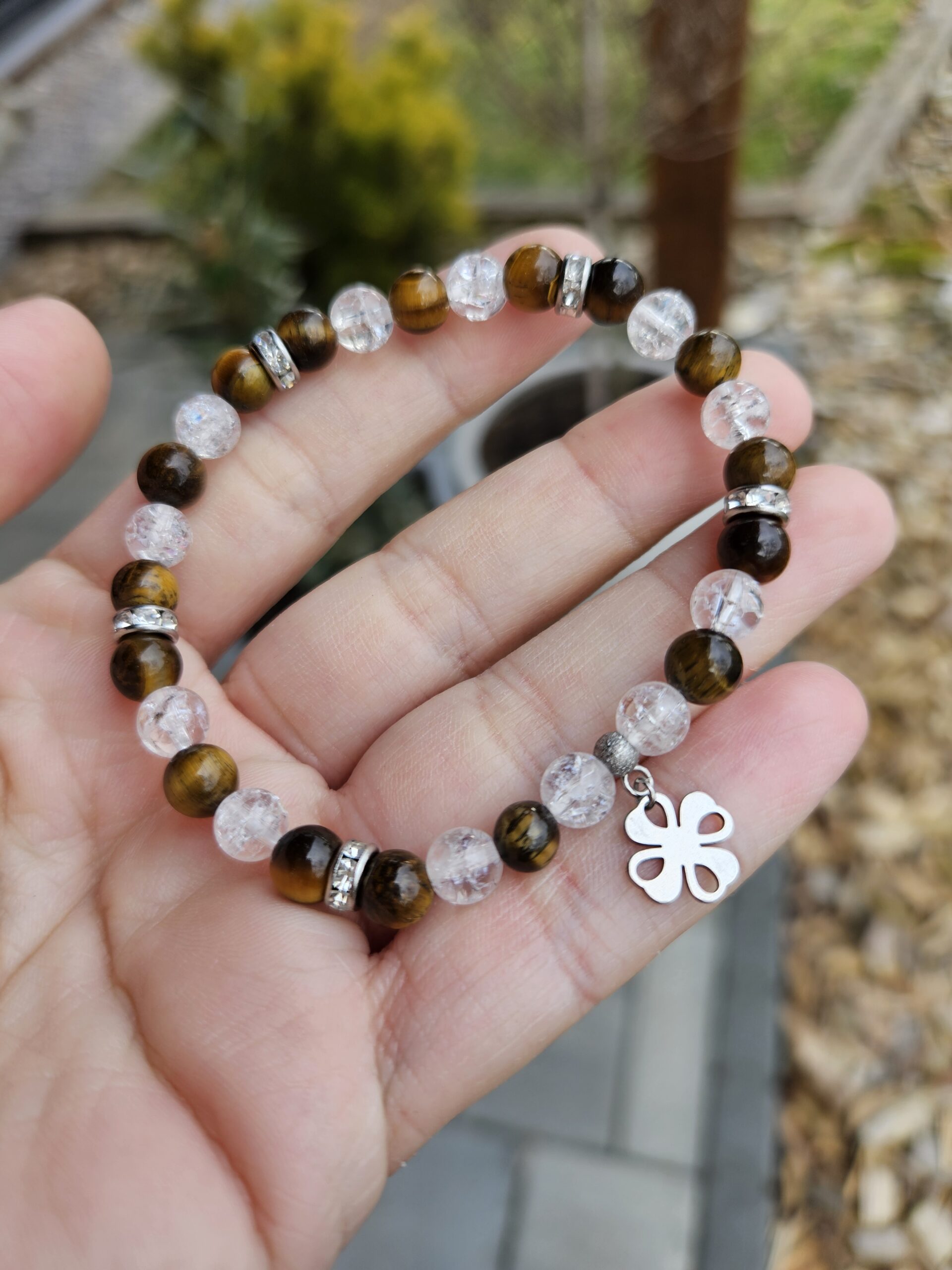 Tigrie oko + Krištáľ náramok 6mm, štvorlístok chir.oceľ
