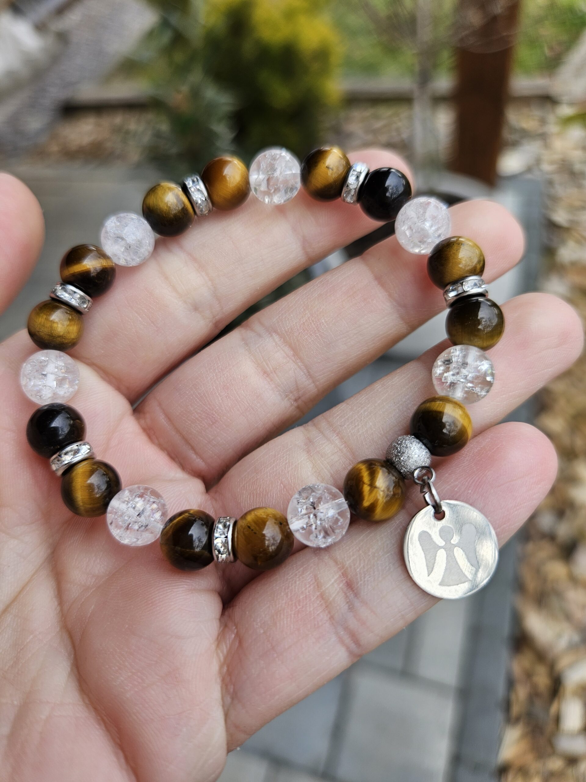 Tigrie oko + Krištáľ náramok 8mm, anjelik chir.oceľ