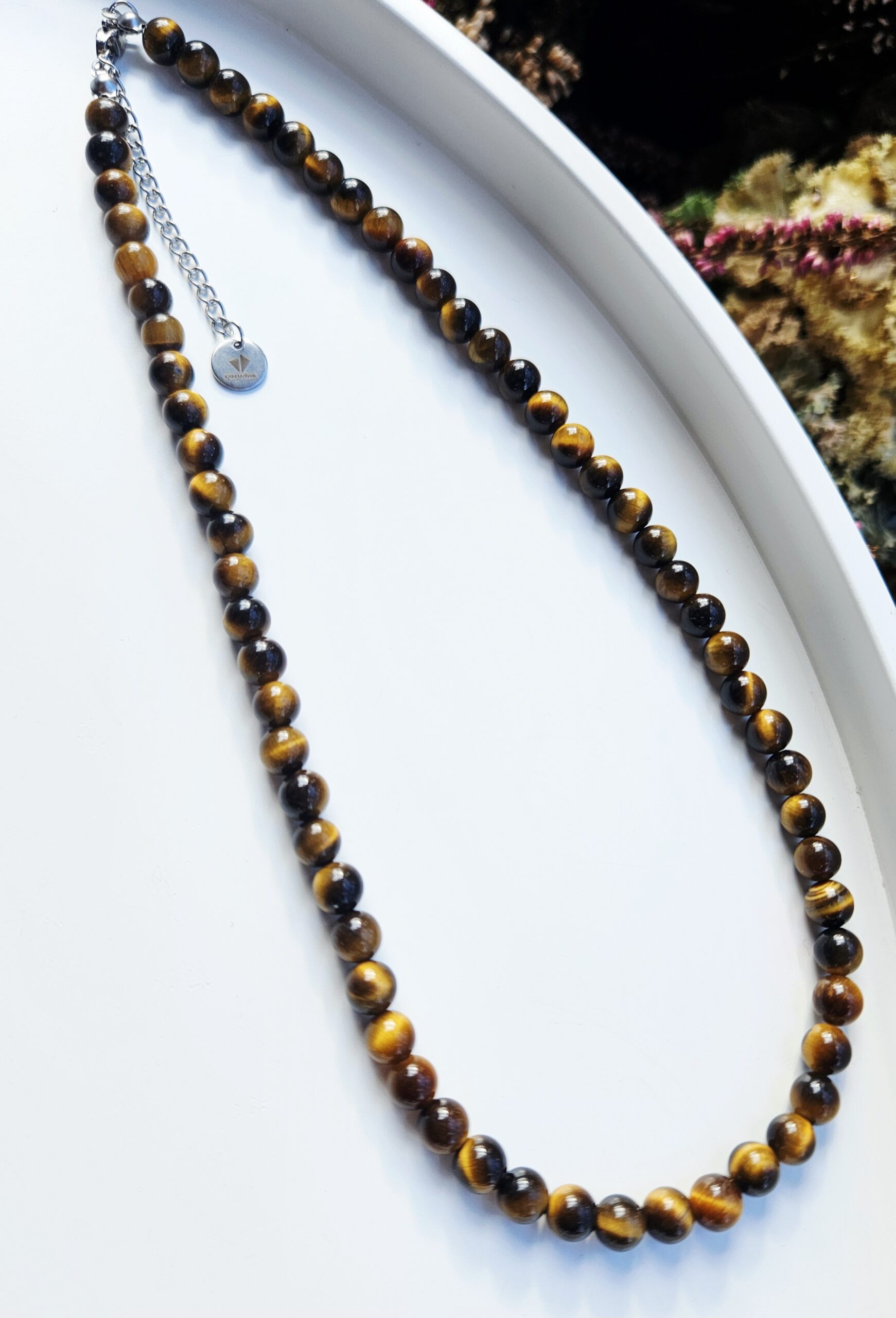 Nádherný náhrdelník z prírodného tigrieho oka v typických hnedo-zlatých odtieňoch. Tento minerál je známy svojím hodvábnym leskom a fascinujúcimi odleskami, ktoré sa pri pohybe na svetle jemne menia.