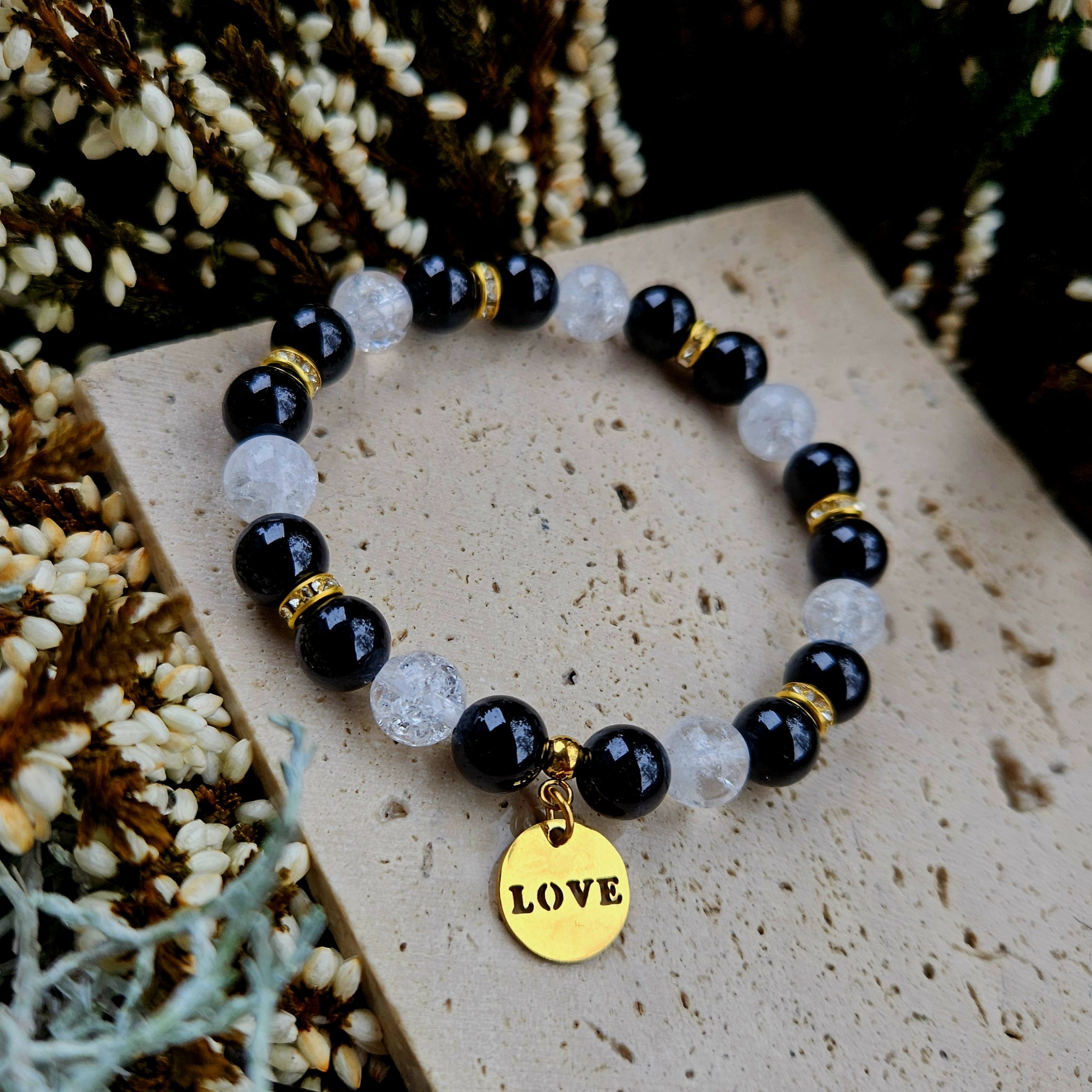 Turmalín čierny + Krištáľ náramok 8mm LOVE zlaté