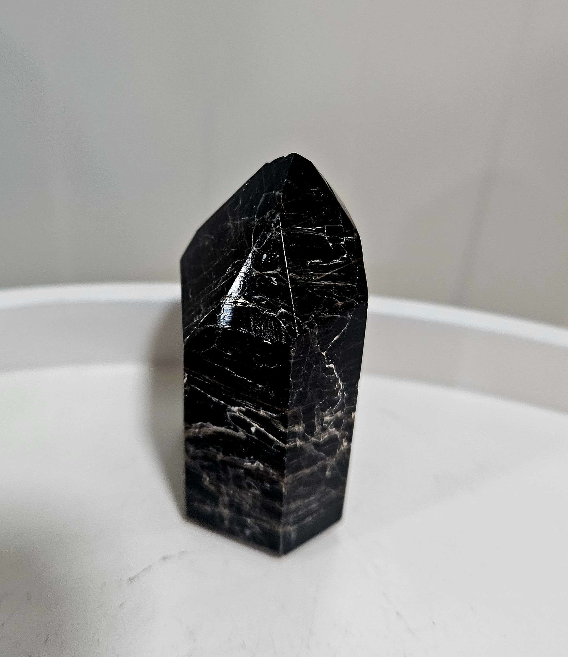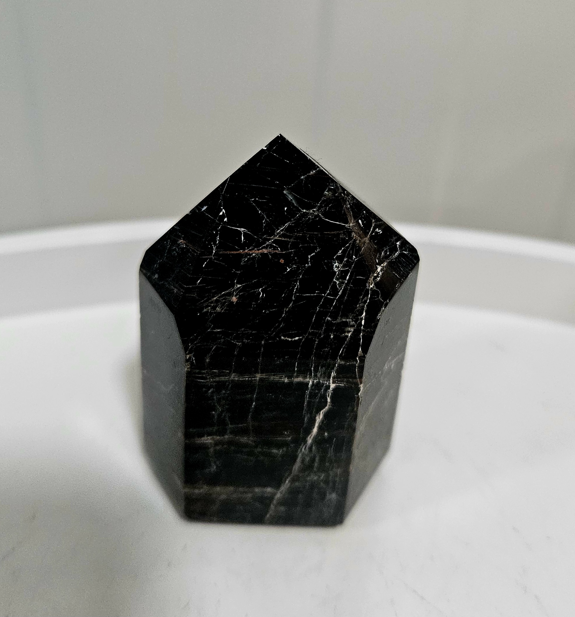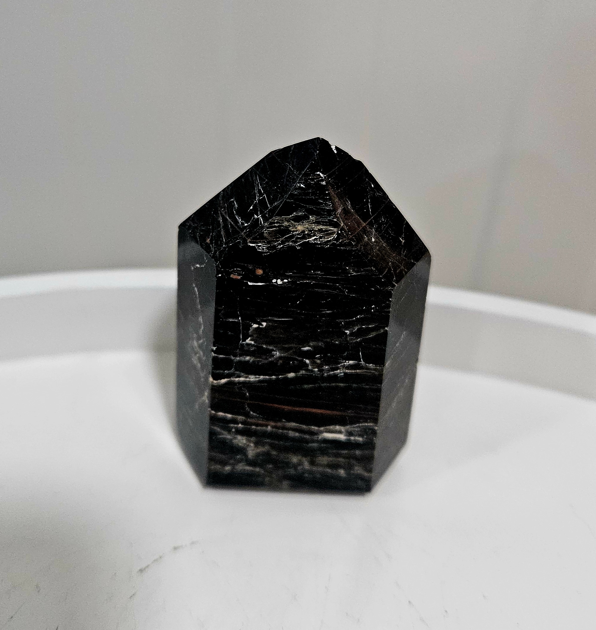 Čierny turmalín je známy ako kameň ochrany a uzemnenia – pomáha pohlcovať negatívnu energiu, vytvára energetický štít a podporuje pocit bezpečia a stability. Obeliskový tvar navyše smeruje energiu nahor, čím harmonizuje priestor a zosilňuje účinok kameňa.