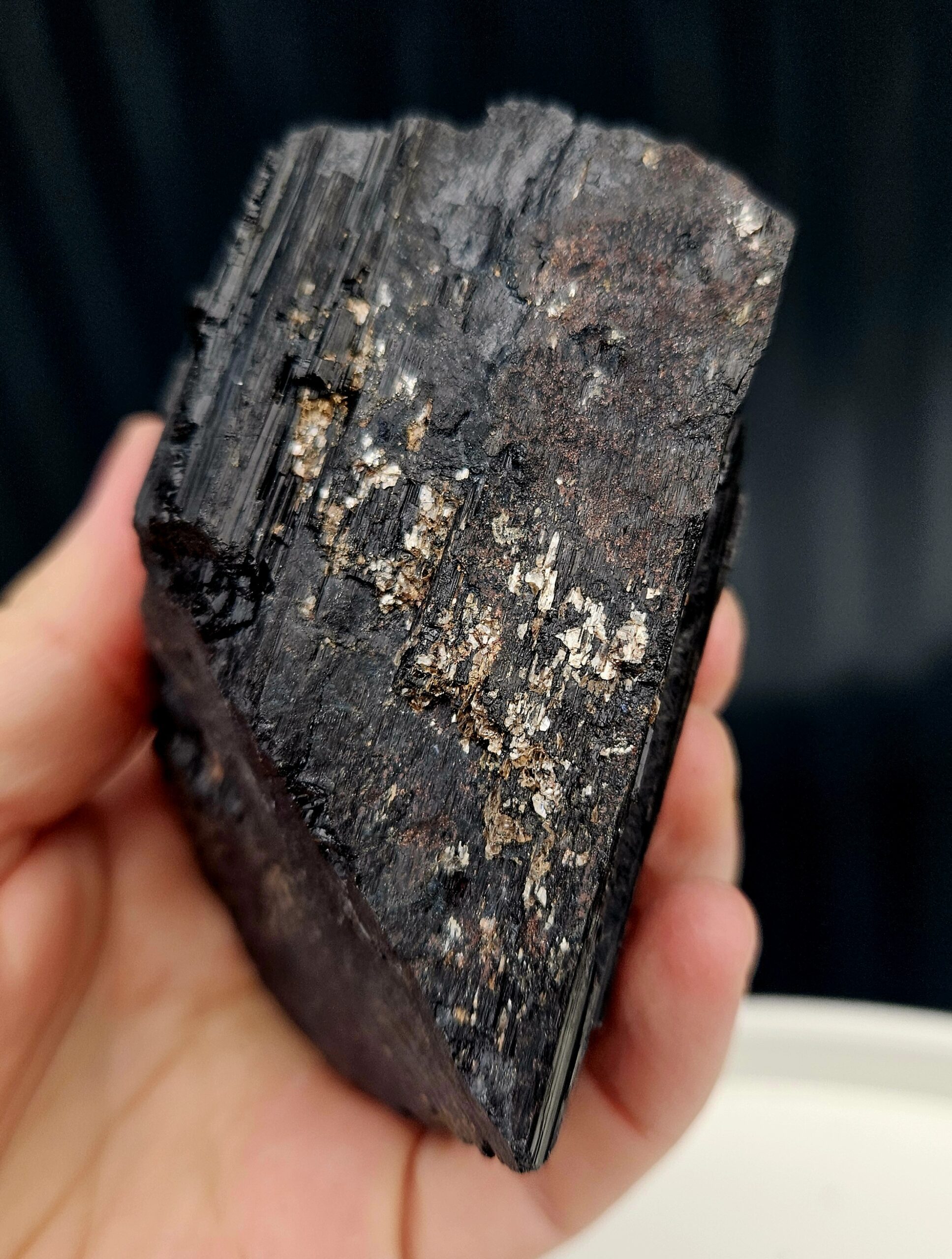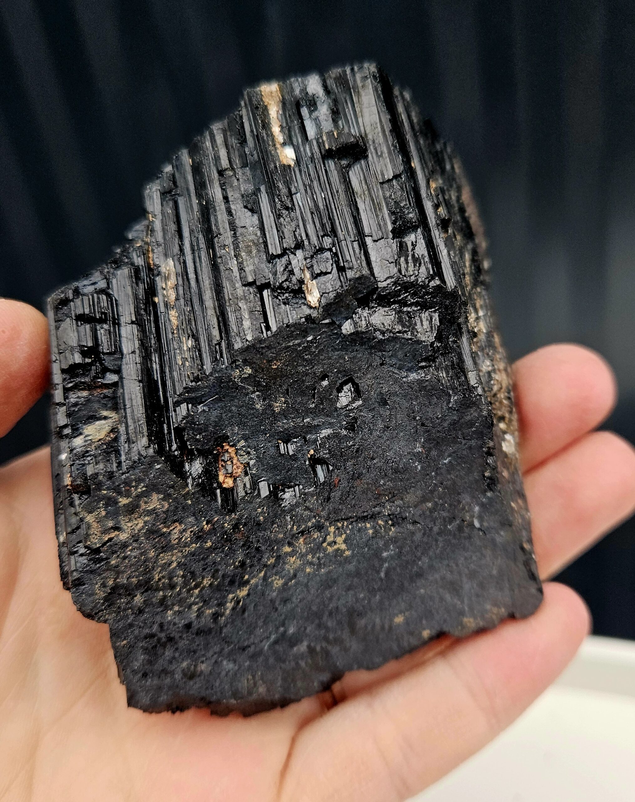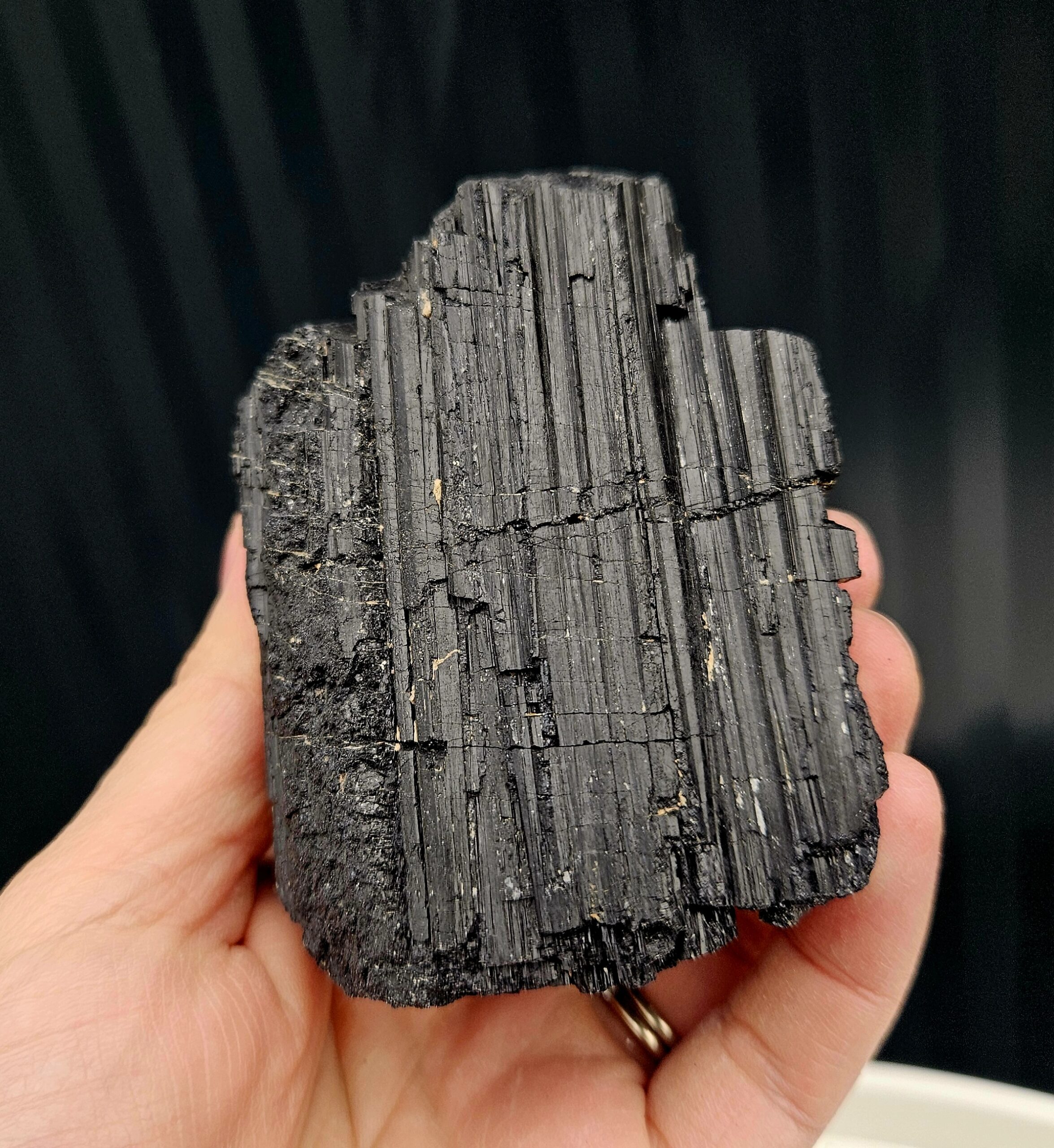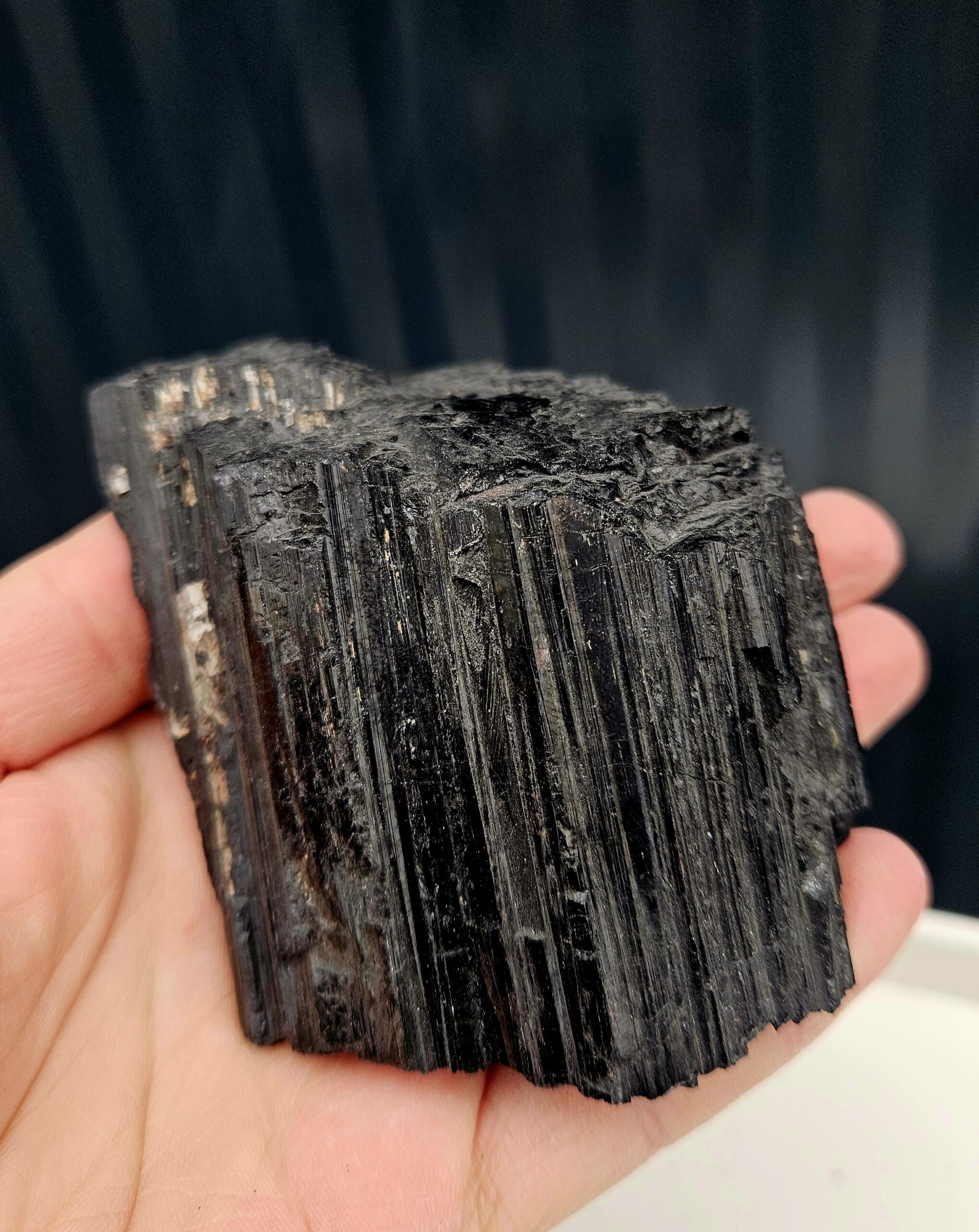Tento surový čierny turmalín (skoryl) má krásny, kompaktný tvar a výraznú prirodzenú štruktúru s typickým ryhovaním. Pôsobí pevne, stabilne a veľmi uzemňujúco – ideálny ako malý, ale silný ochranca do každého priestoru.
