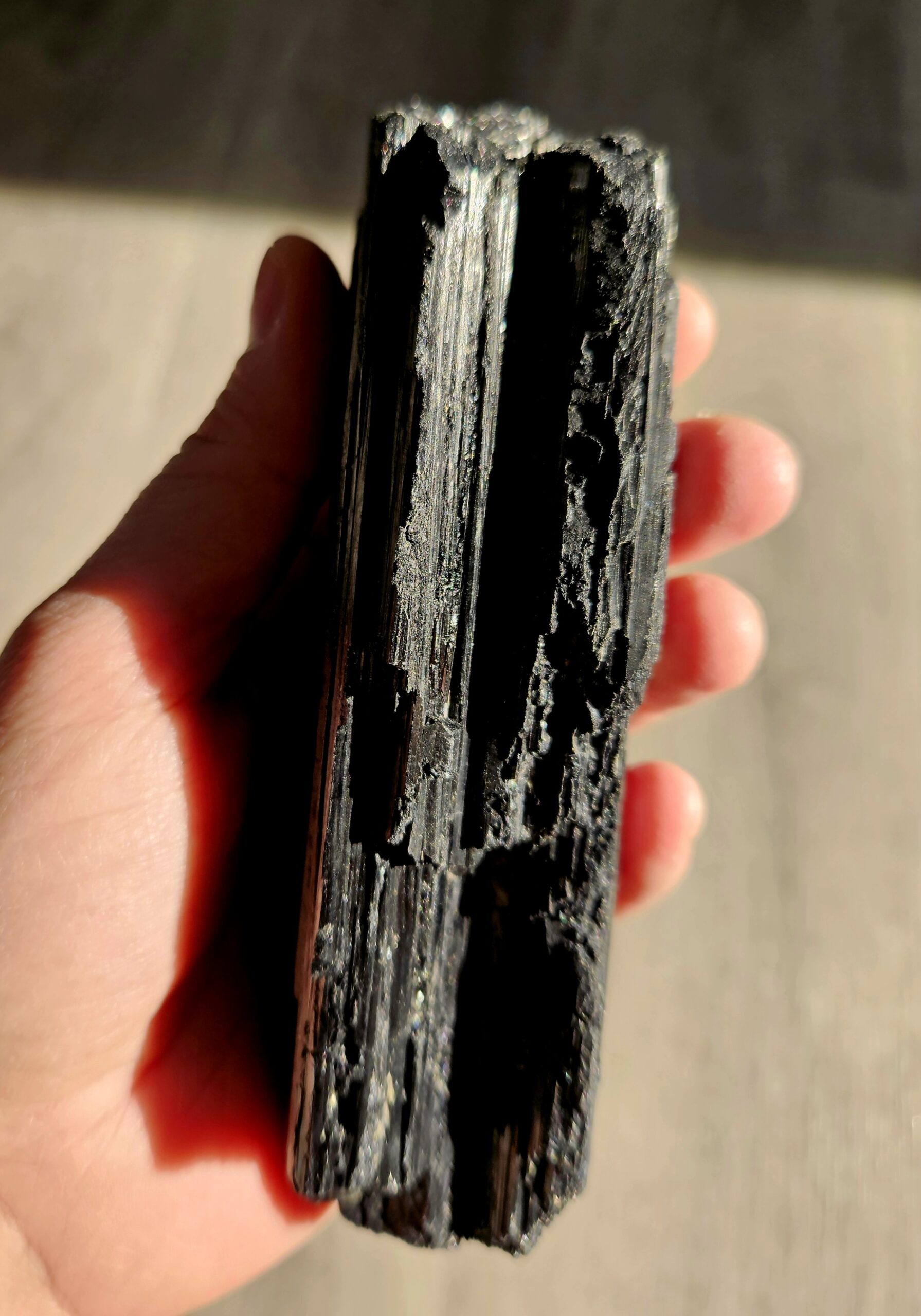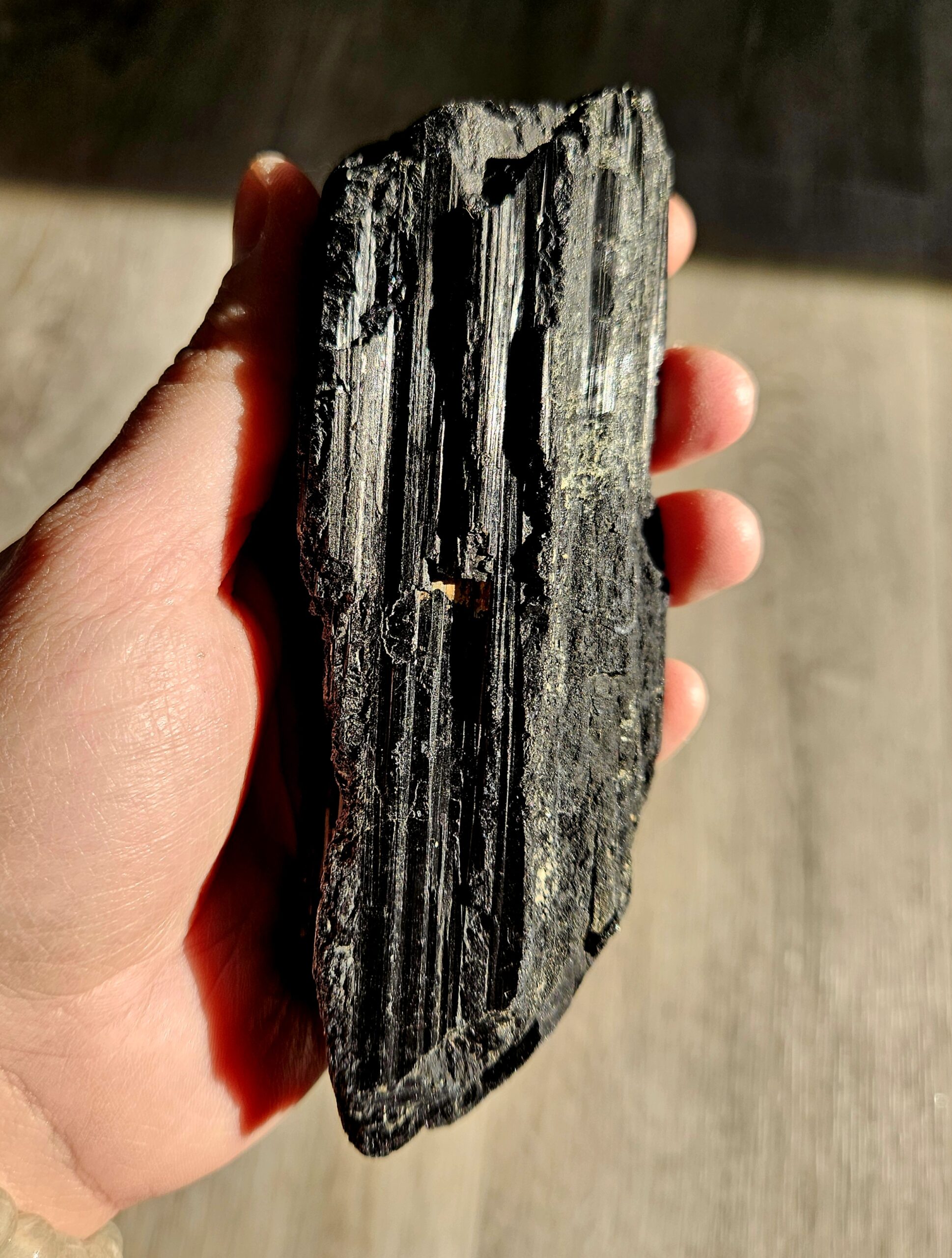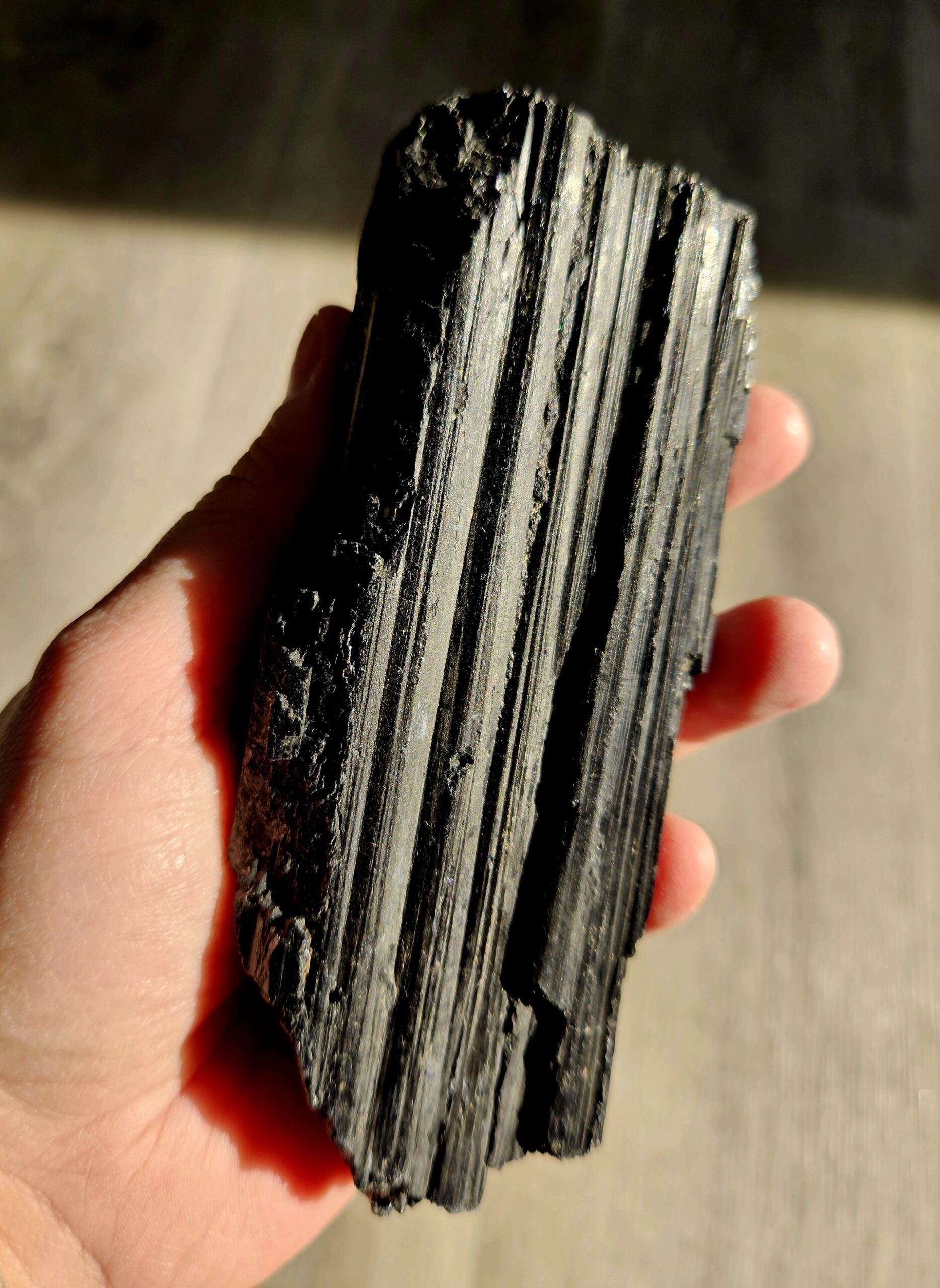 Masívny a výrazný kus čierneho turmalínu v jeho prirodzenej, surovej podobe. Tento minerál zaujme svojou typickou ryhovanou štruktúrou a silnou, ochrannou energiou.