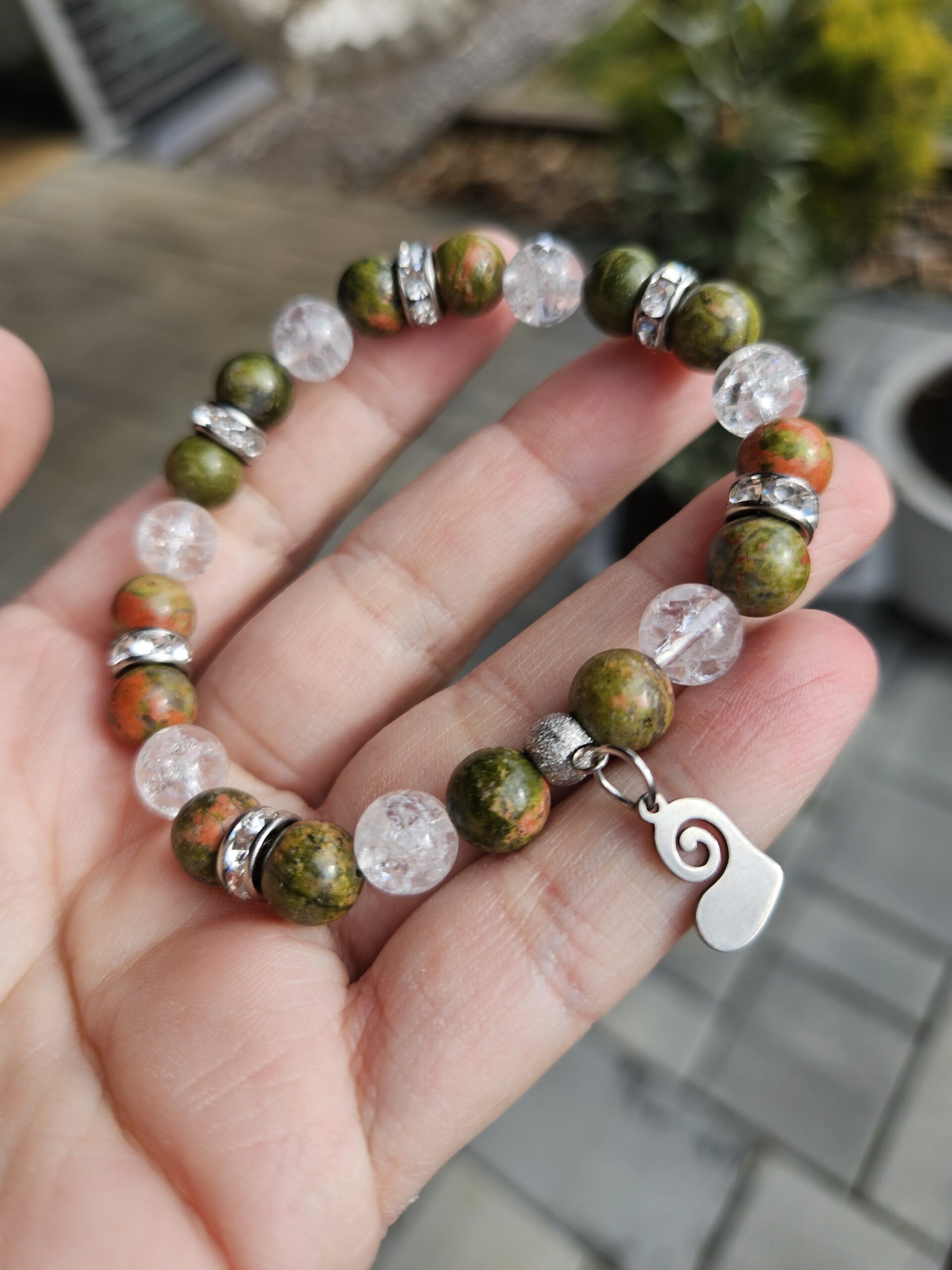 Unakit + Krištáľ náramok 8mm SRDIEČKO