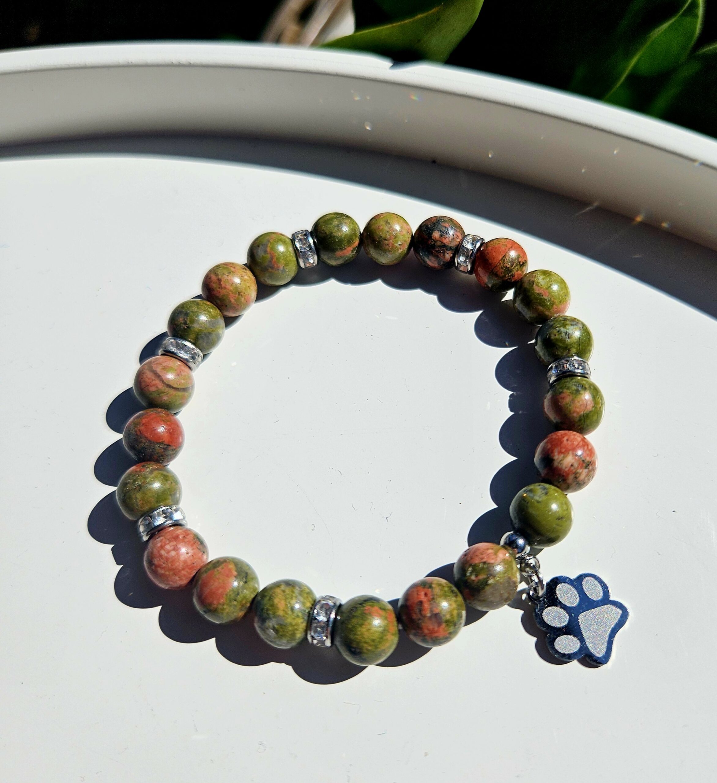 Náramok z prírodného unakitu v jemnej kombinácii zelených a tehlovo-červených odtieňov, ktorý pôsobí harmonicky a elegantne. Každá guľôčka je originál, vďaka čomu je každý kus jedinečný.