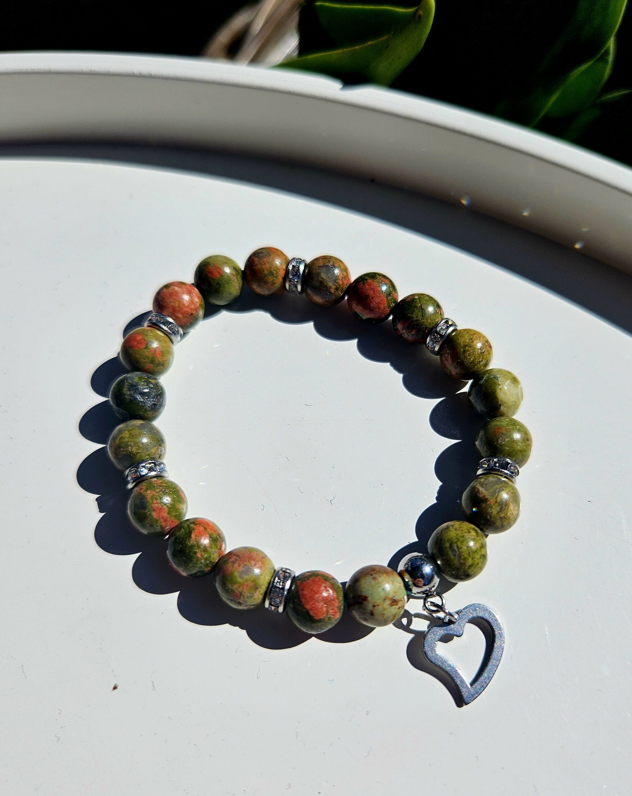 Náramok z prírodného unakitu v jemnej kombinácii zelených a tehlovo-červených odtieňov, ktorý pôsobí harmonicky a elegantne. Každá guľôčka je originál, vďaka čomu je každý kus jedinečný.