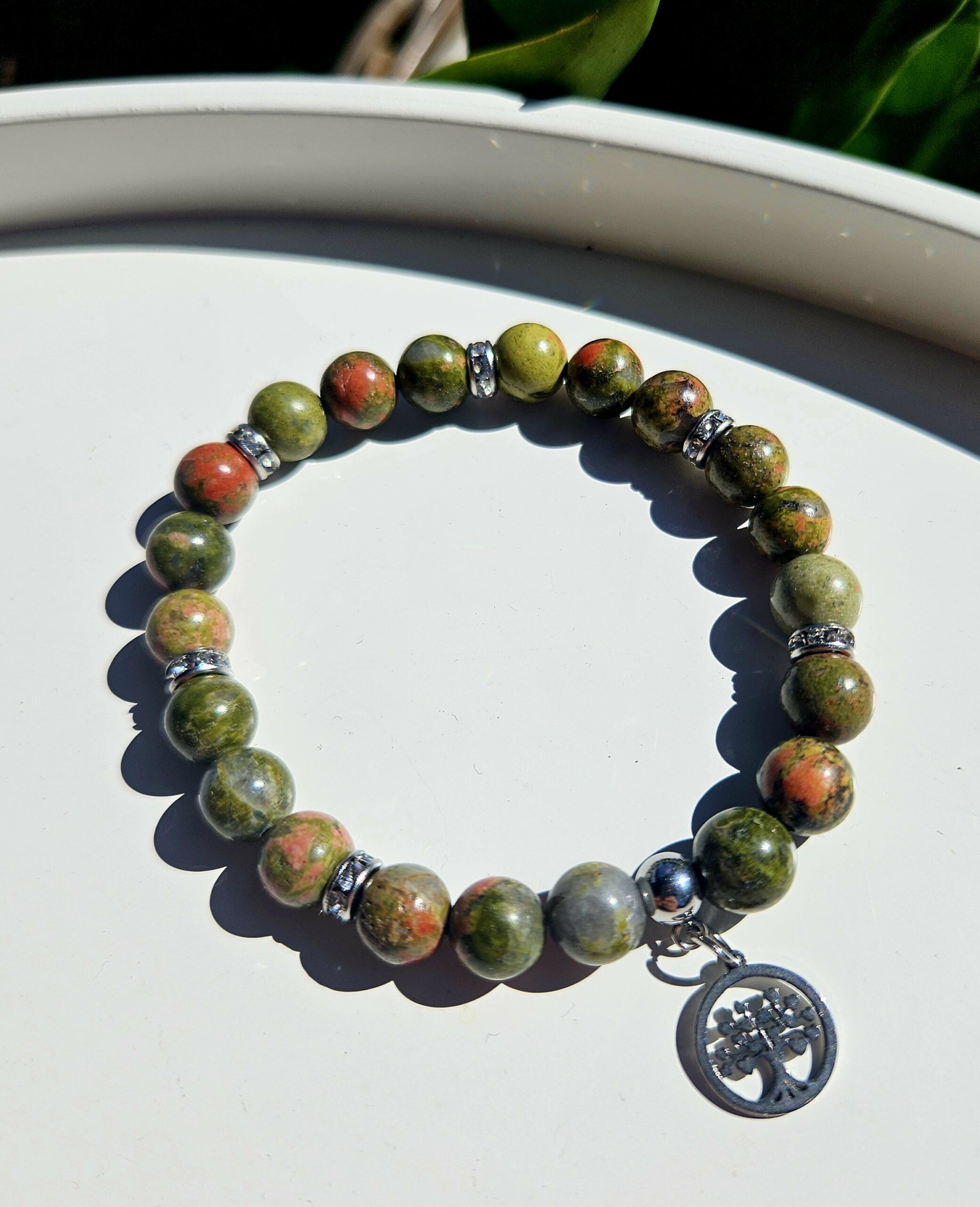 Náramok z prírodného unakitu v jemnej kombinácii zelených a tehlovo-červených odtieňov, ktorý pôsobí harmonicky a elegantne. Každá guľôčka je originál, vďaka čomu je každý kus jedinečný.