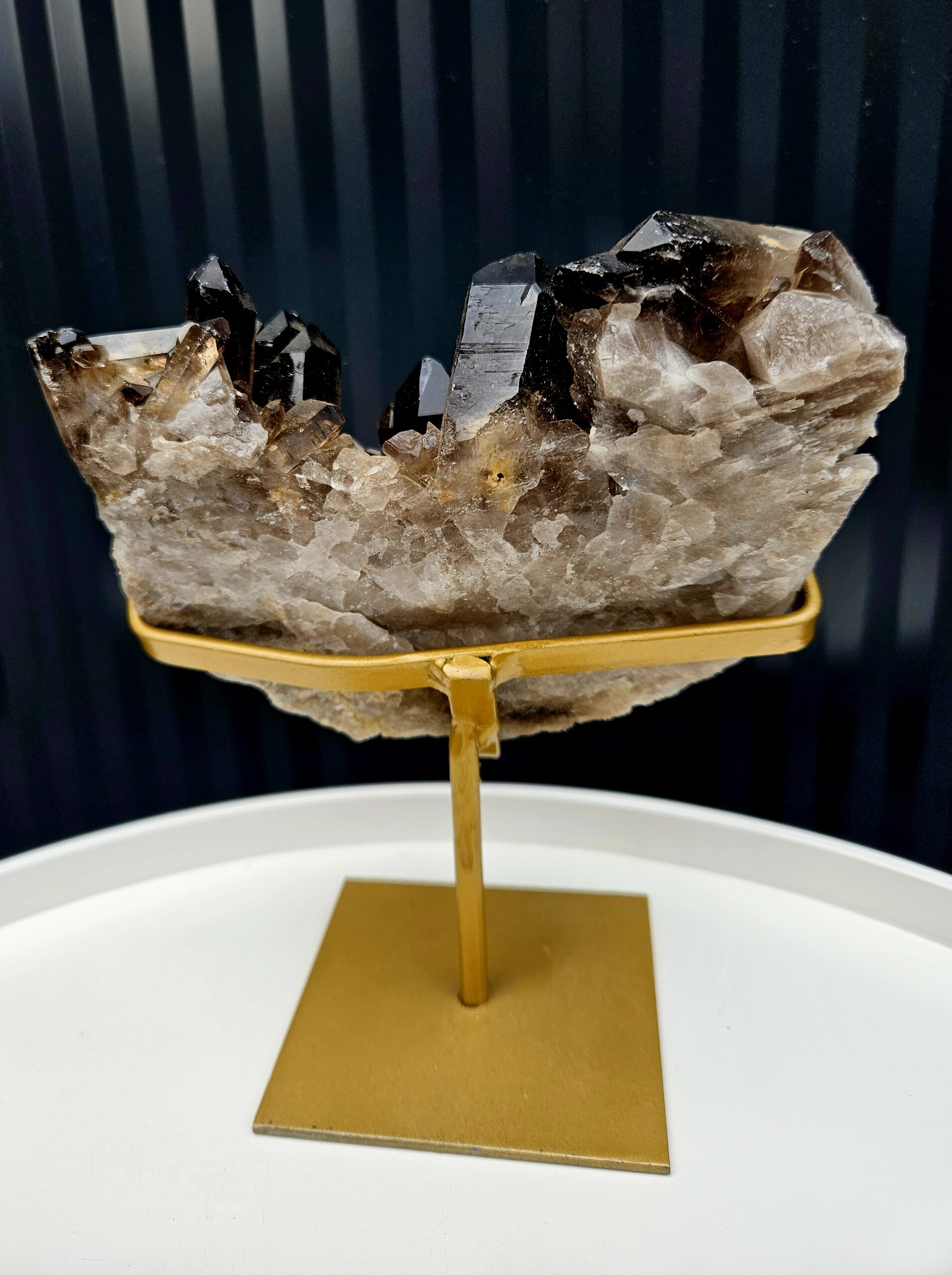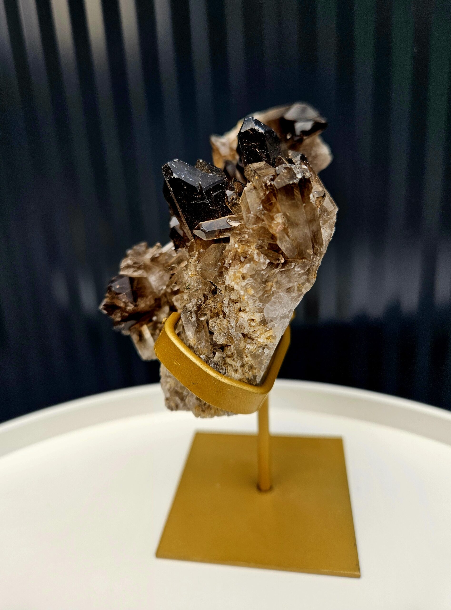 Impozantný a výrazný kúsok záhnedy s krásne vyvinutými, lesklými kryštálmi v hlbokých dymovo-hnedých odtieňoch. Dominantné hroty dodávajú drúze silný charakter a spolu so zlatým stojanom vytvárajú luxusnú a elegantnú dekoráciu.