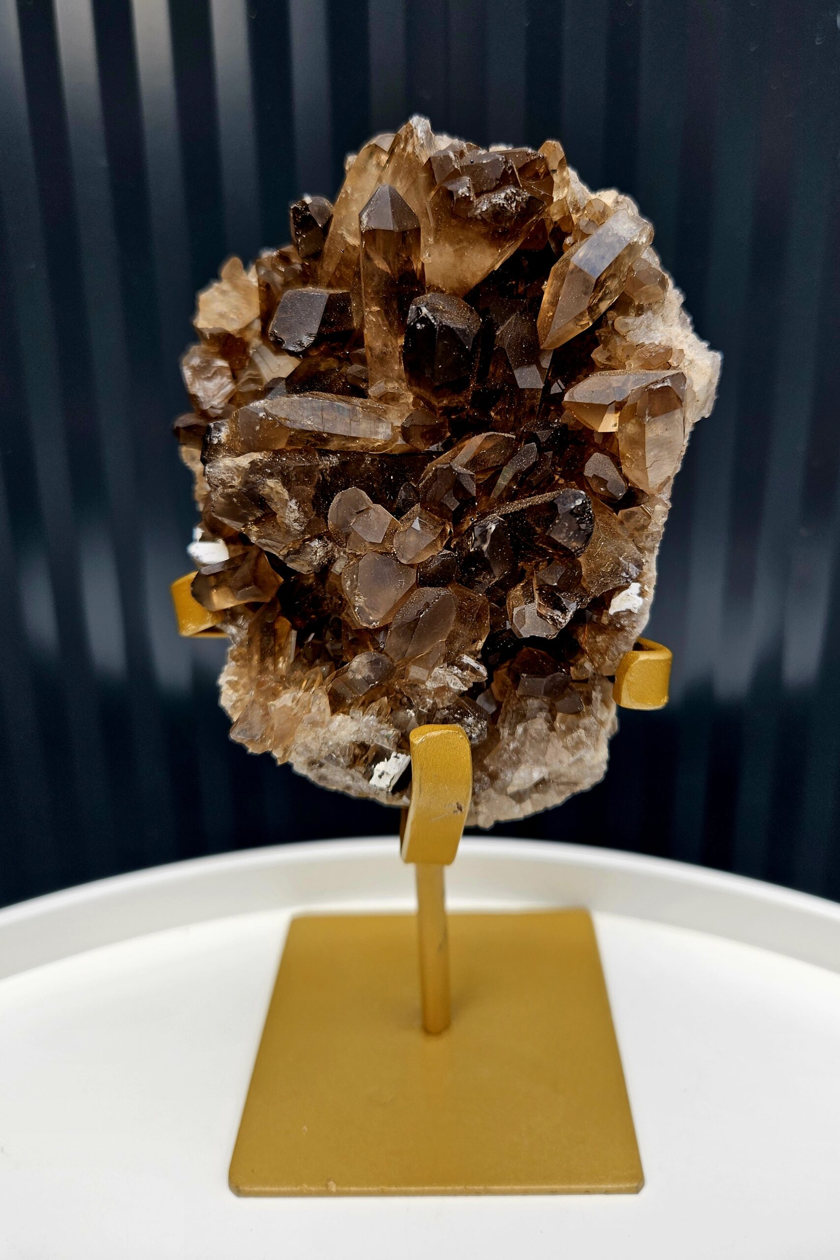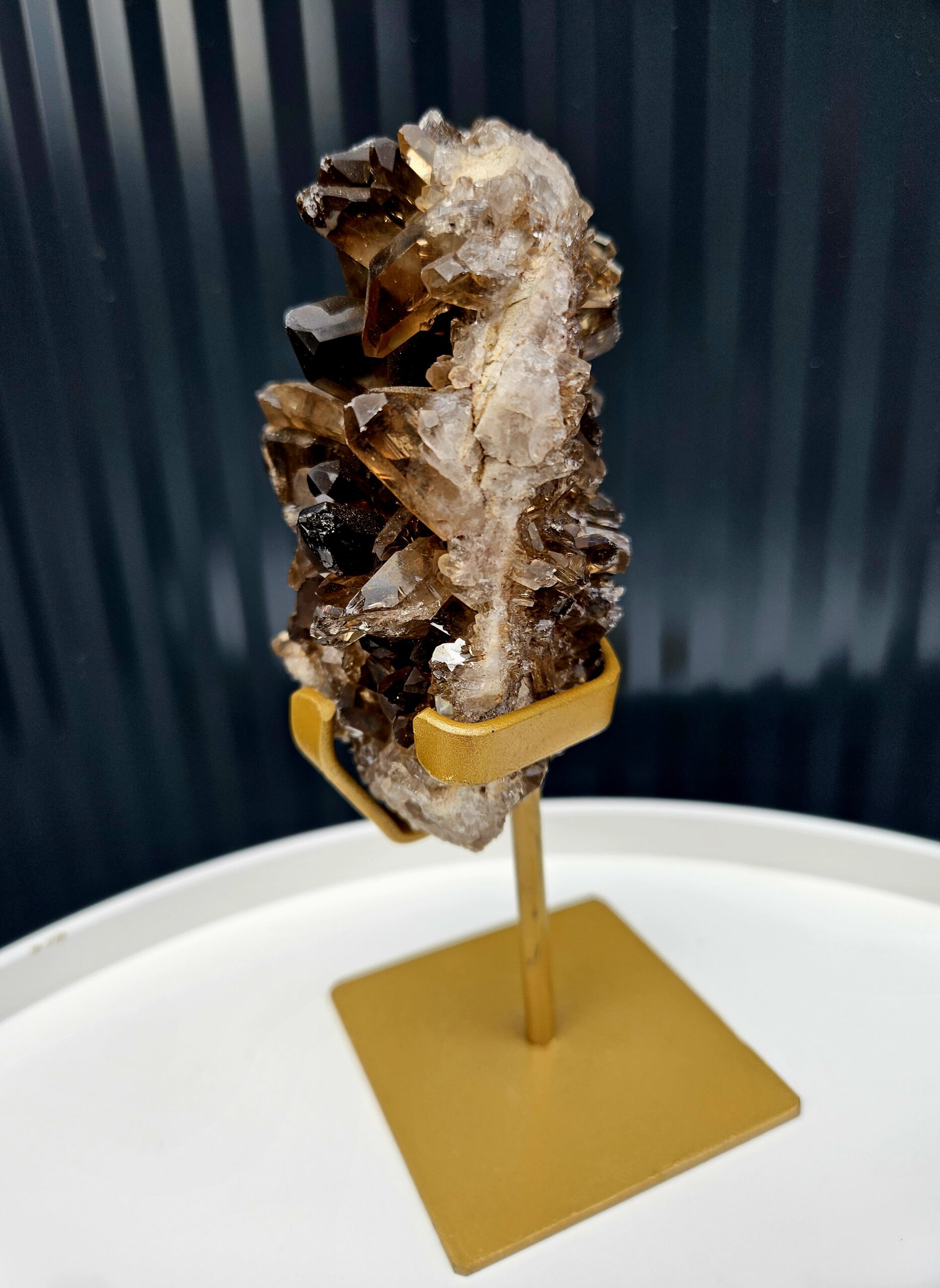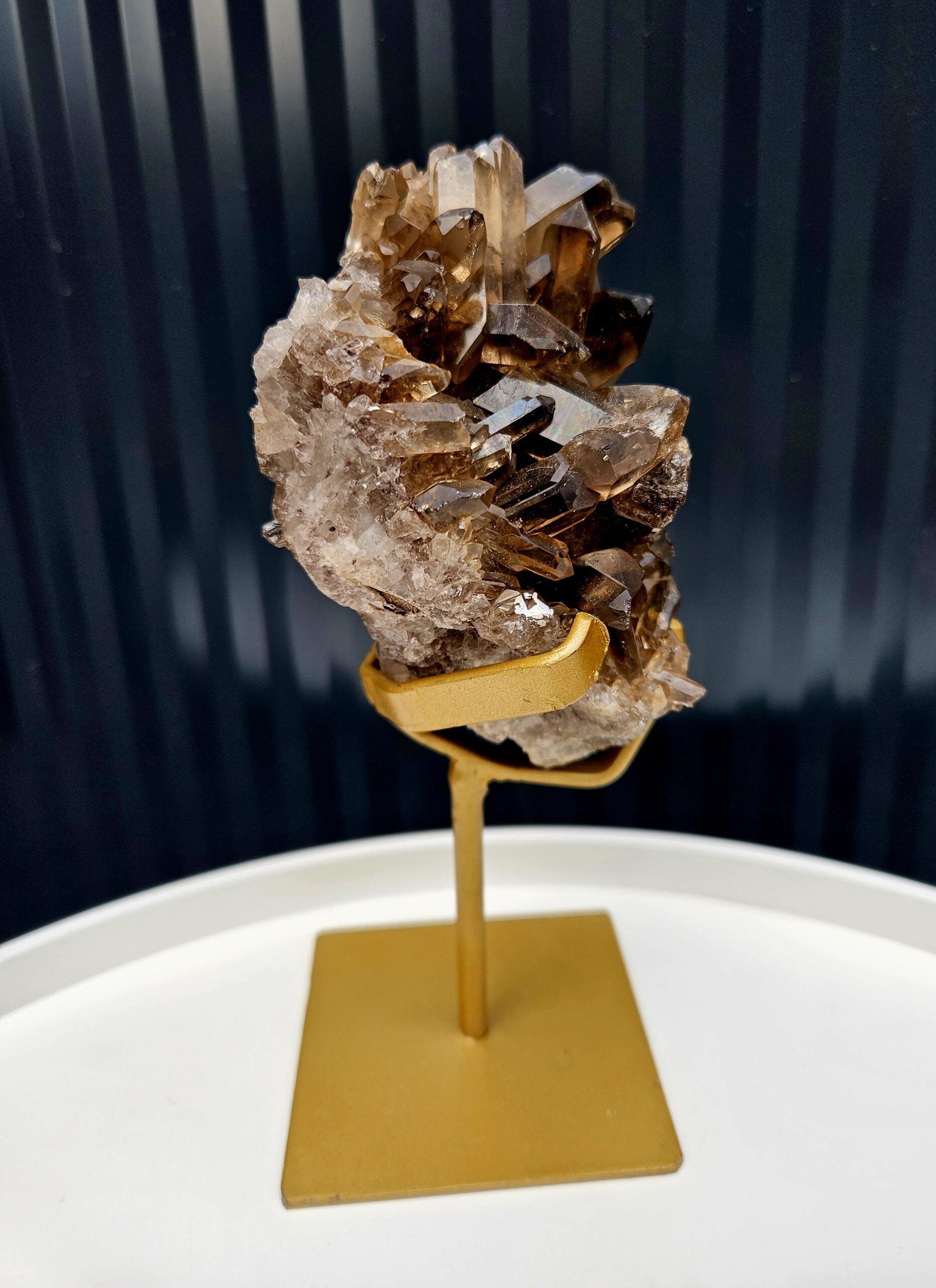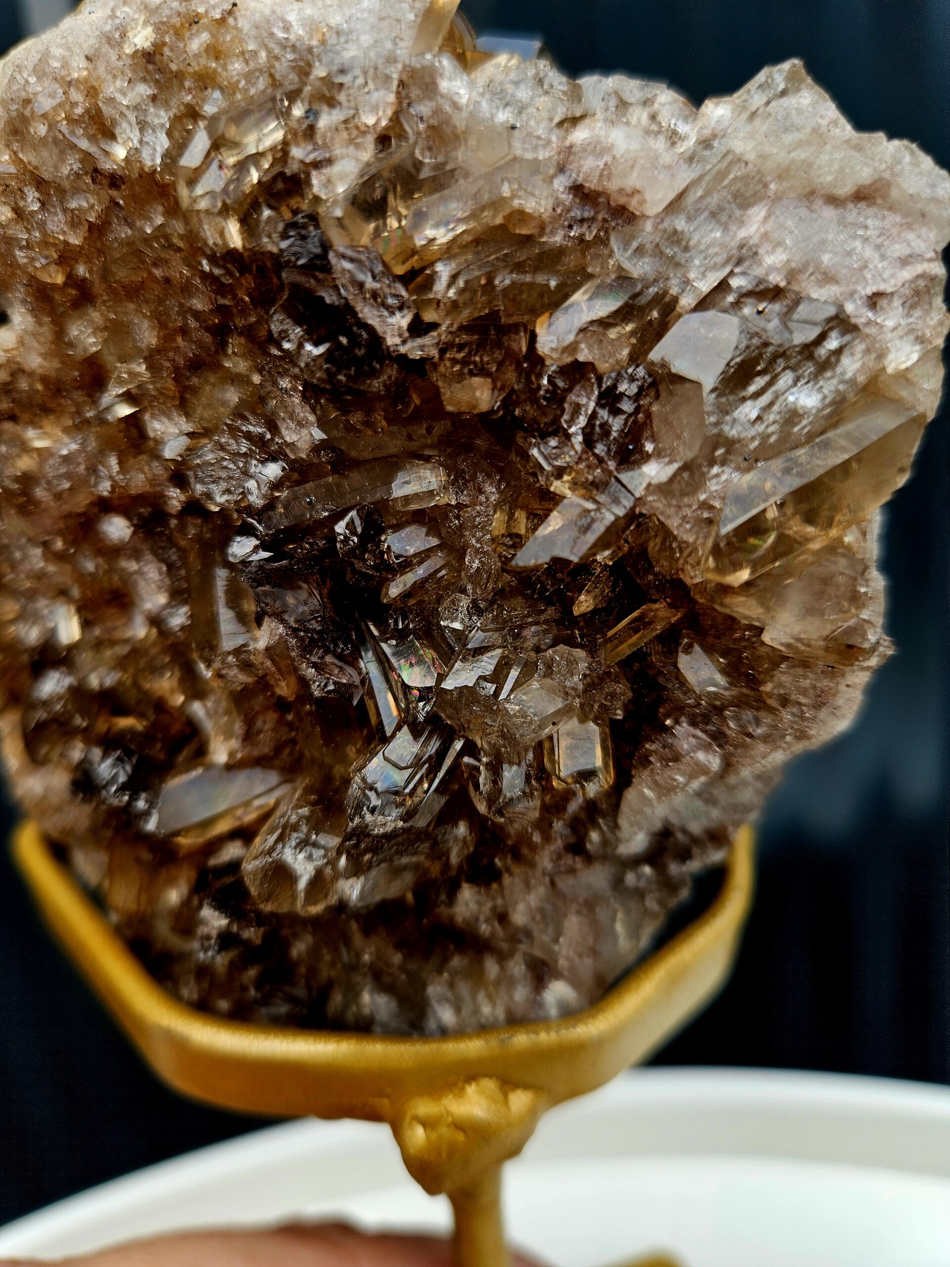 Výrazný a jedinečný kúsok záhnedy s bohatou kryštalickou štruktúrou, ktorý okamžite pritiahne pozornosť. Kryštály v odtieňoch dymovej hnedej vytvárajú nádherný lesk a hĺbku, pričom zlatý stojan dodáva celej kompozícii luxusný vzhľad.