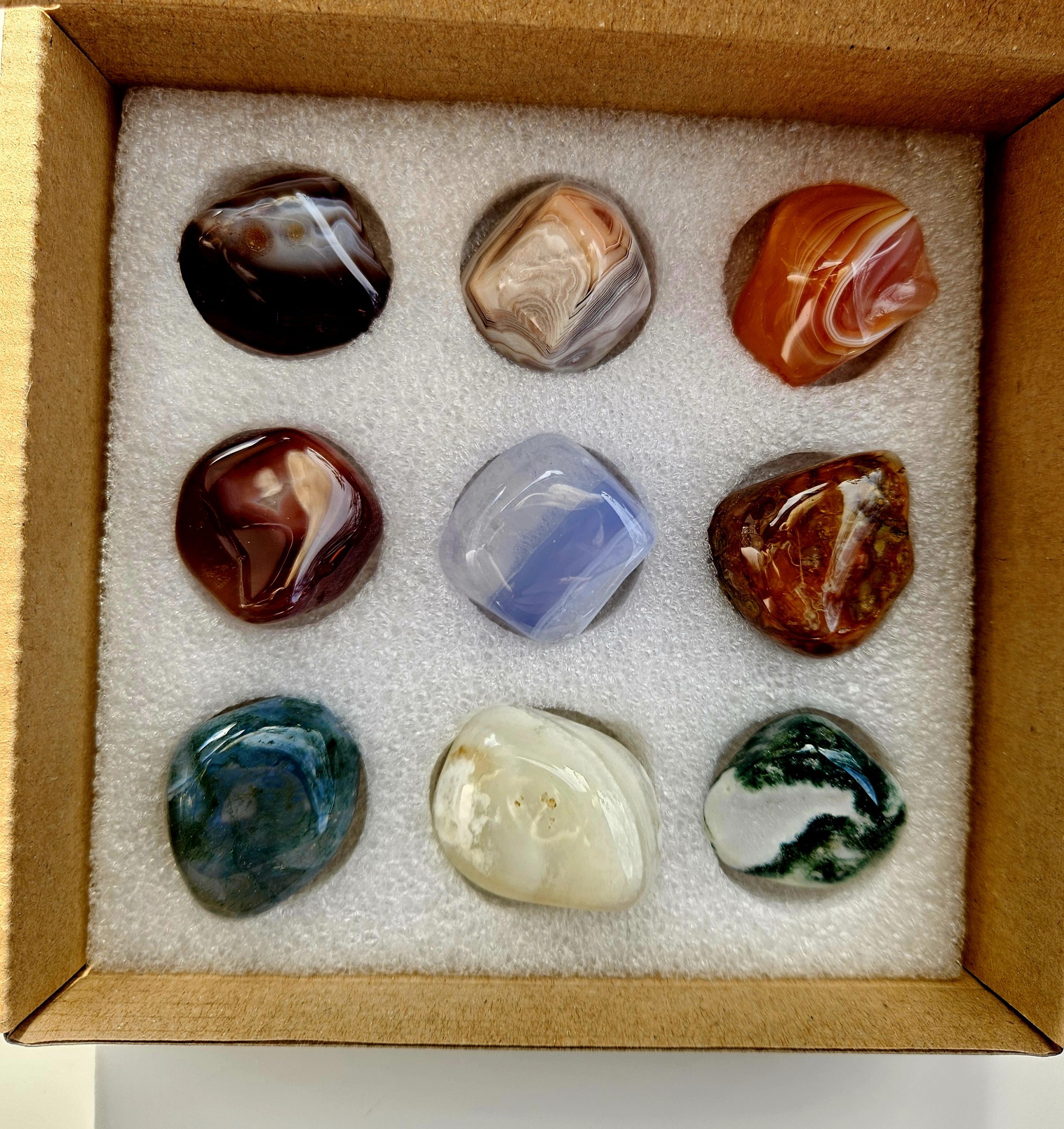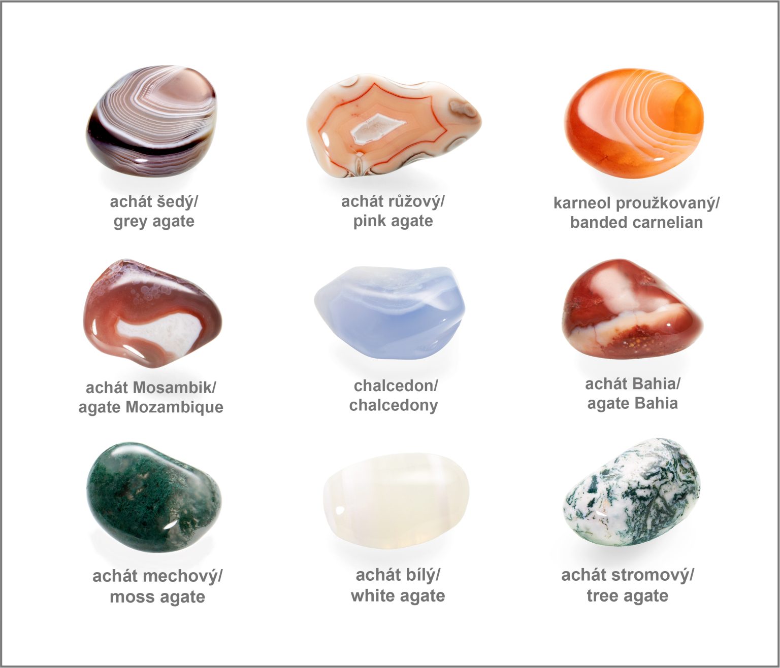 Zberateľská kolekcia ACHÁTY obsahuje deväť tromlovaných kameňov veľ. XL. Každý kameň zastupuje iný druh achátu – názvy, popisy aj lokácie sú uvedené na webovej stránke, na ktorú sa dostanete po načítaní QR kódu na krabičke. V sade nájdete tieto obľúbené druhy achátov: achát šedý Botswana, achát ružový Botswana, karneol Botswana prúžkovaný, achát Mozambik, chalcedón Malawi, achát Bahia, achát machový, achát biely a achát stromový. Kamene sú bezpečne uložené v pevnom bloku z penového polyetylénu a chránené proti rozsypaniu špeciálnou vložkou z rovnakého materiálu. Elegantné a pevné krabičky z kvalitnej lepenky zaujmú originálnou a štýlovou grafikou a praktickým zatváraním.