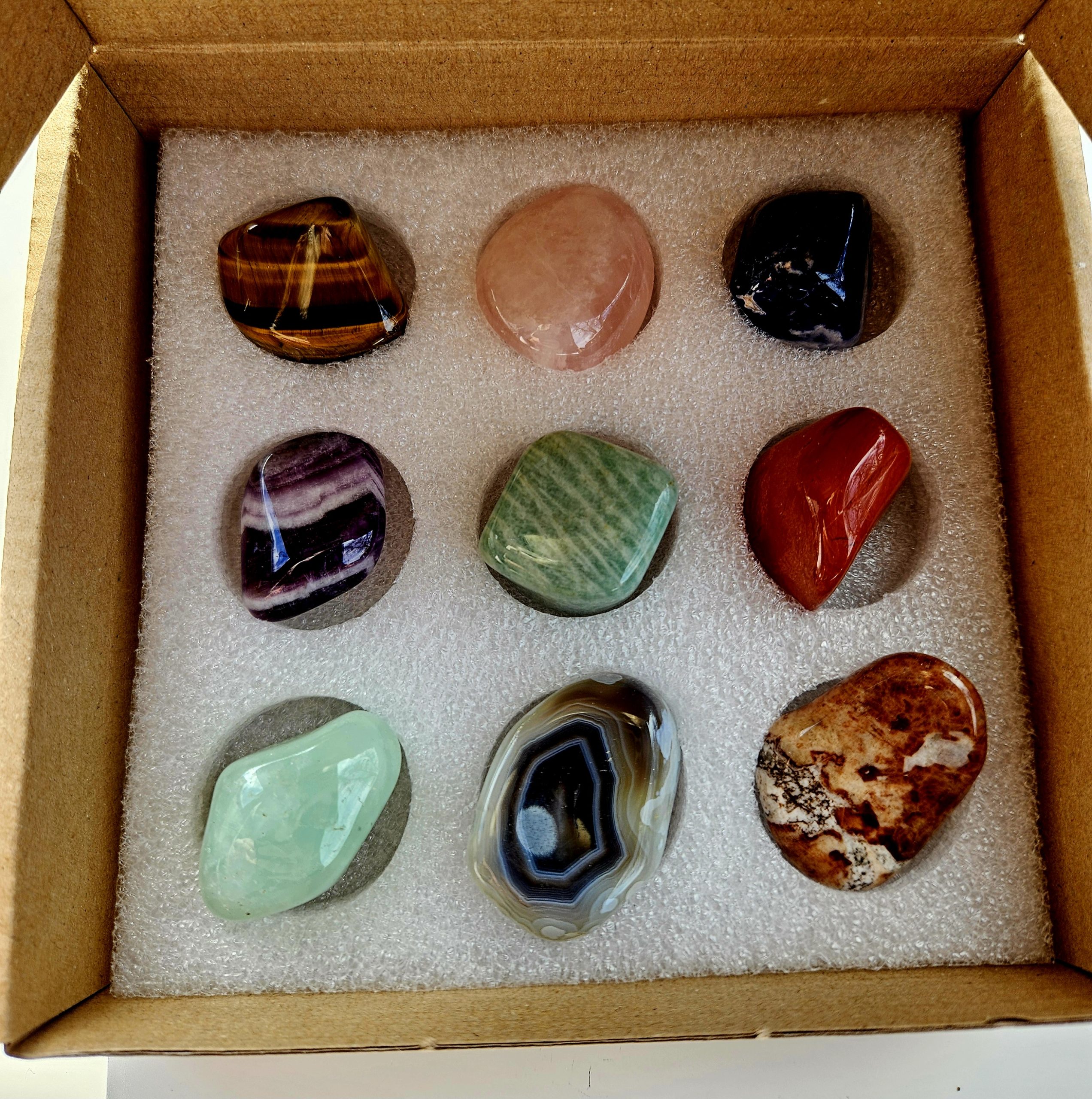 Unikátna zemepisná zbierka AFRIKA s deviatimi tromlovanými kameňmi veľ. XL. Každý z kameňov pochádza z inej časti afrického kontinentu – názvy,