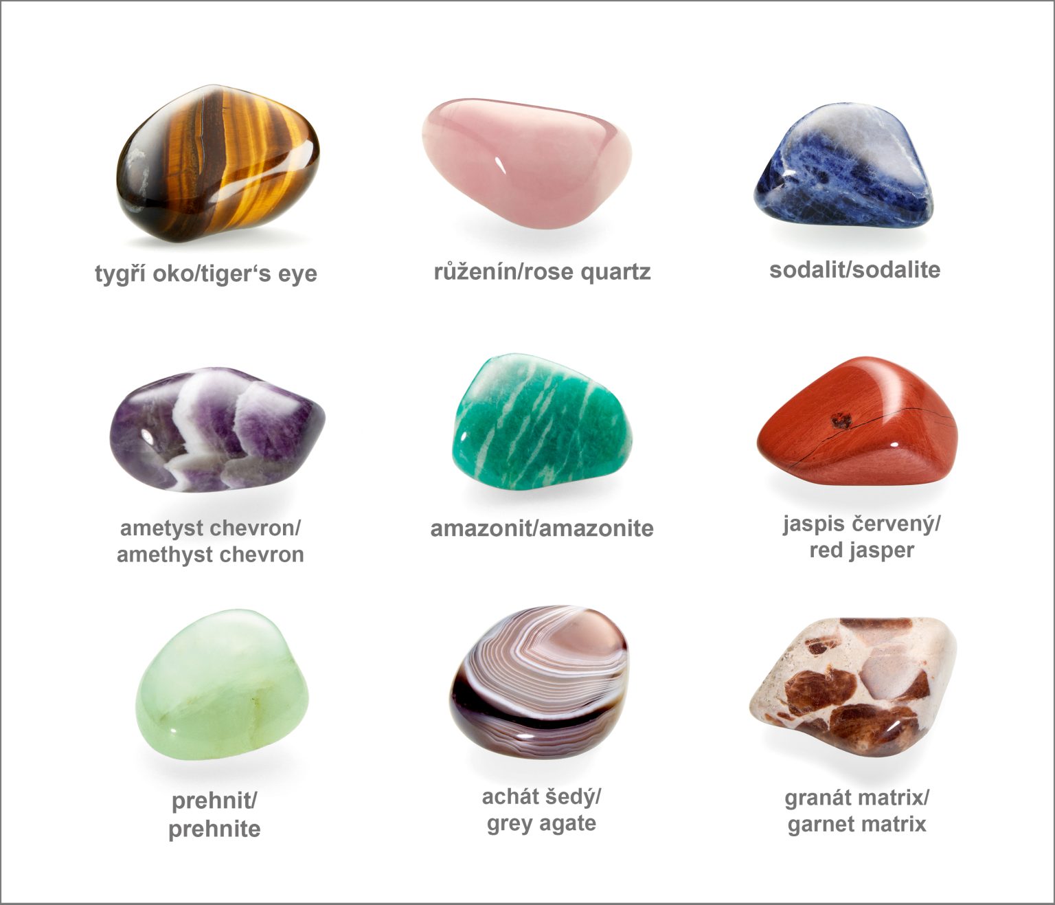 V sade nájdete tieto obľúbené druhy kameňov: tigrie oko, ruženín, sodalít, ametyst chevron, amazonit, jaspis červený, prehnit, achát šedý a granát matrix.