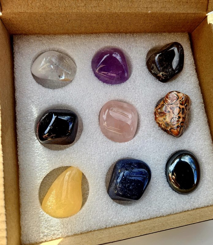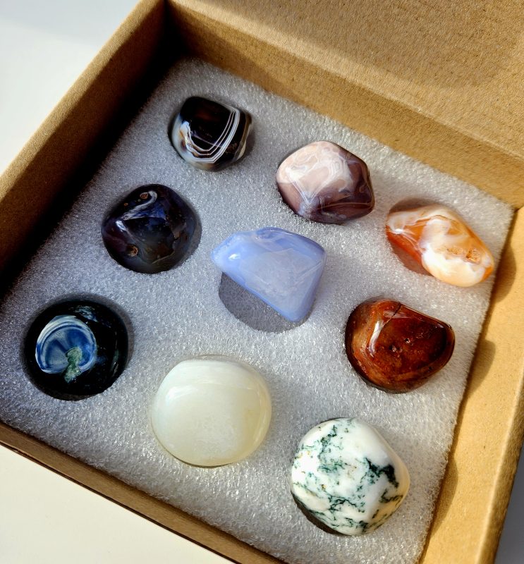 Zberateľská kolekcia ACHÁTY obsahuje deväť tromlovaných kameňov veľ. XL. Každý kameň zastupuje iný druh achátu – názvy, popisy aj lokácie sú uvedené na webovej stránke, na ktorú sa dostanete po načítaní QR kódu na krabičke. V sade nájdete tieto obľúbené druhy achátov: achát šedý Botswana, achát ružový Botswana, karneol Botswana prúžkovaný, achát Mozambik, chalcedón Malawi, achát Bahia, achát machový, achát biely a achát stromový. Kamene sú bezpečne uložené v pevnom bloku z penového polyetylénu a chránené proti rozsypaniu špeciálnou vložkou z rovnakého materiálu. Elegantné a pevné krabičky z kvalitnej lepenky zaujmú originálnou a štýlovou grafikou a praktickým zatváraním.