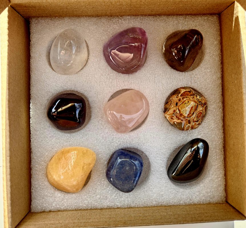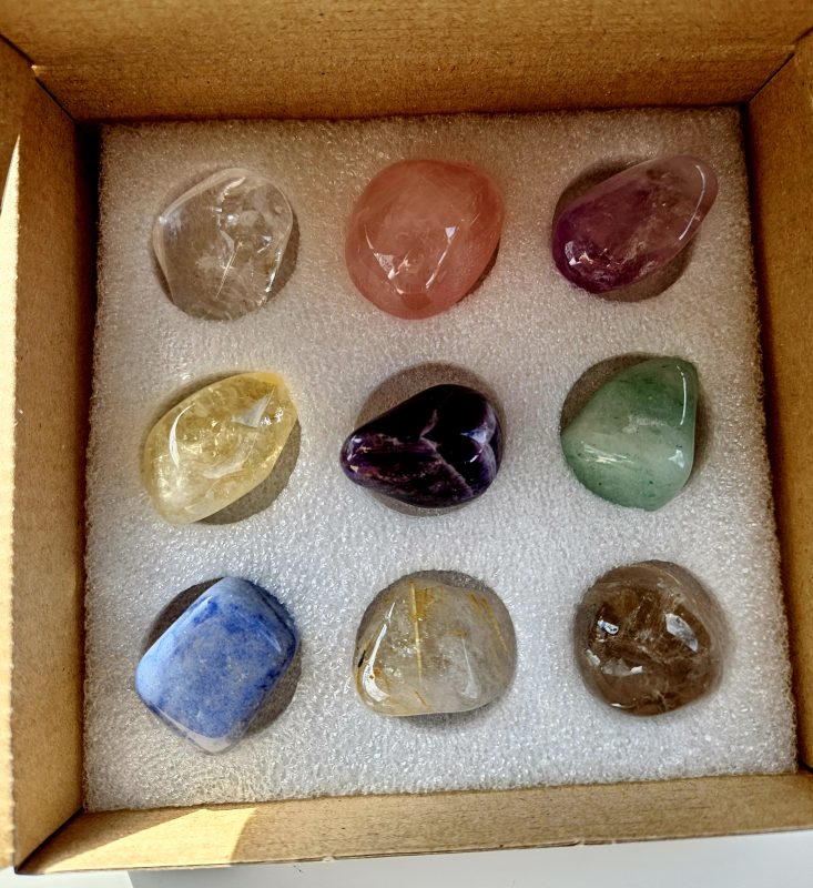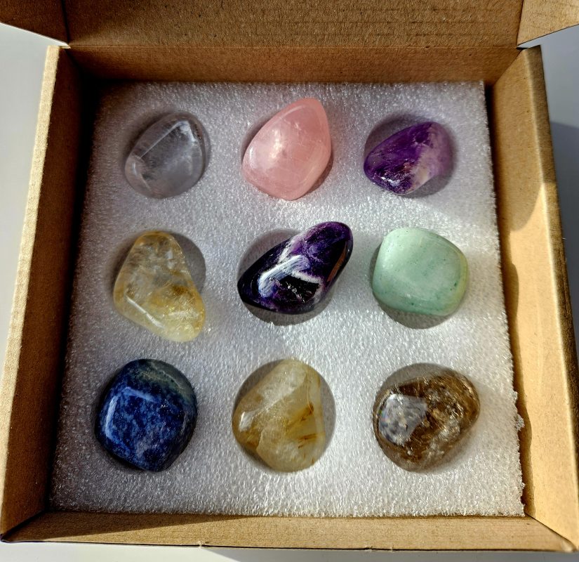 V sade nájdete 9 najobľúbenejších druhov kremeňov: krištáľ, ruženín, ametyst, citrín, ametyst chevron, avanturín, modrý kremeň, krištáľ s rutilom a záhneda. Kamene sú bezpečne uložené v pevnom bloku z penového polyetylénu a chránené proti rozsypaniu špeciálnou vložkou z rovnakého materiálu. Elegantné a pevné krabičky z kvalitnej lepenky zaujmú originálnou a štýlovou grafikou a praktickým zatváraním.