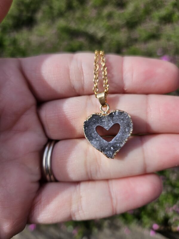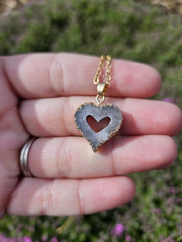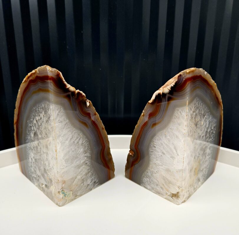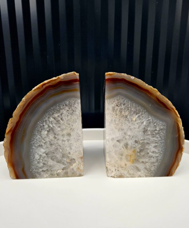 Unikátny prírodný kúsok, ktorý zaujme svojou jemnou kresbou vrstiev a trblietavým kryštalickým jadrom. Každá polovica do seba dokonale zapadá a spolu vytvára harmonický celok.