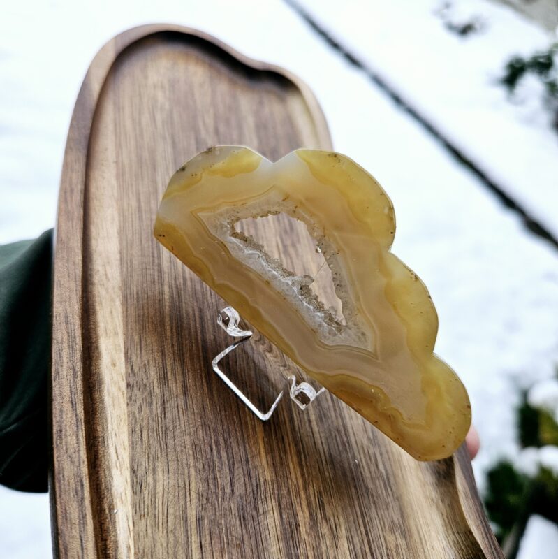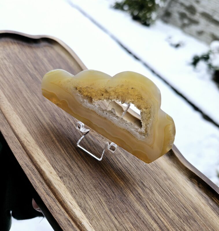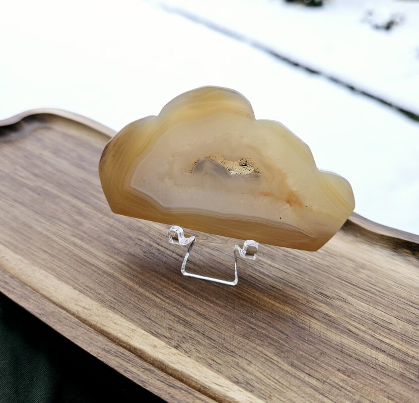 Jemné krémovo-medové vrstvy achátu obklopujú bohato kryštálové jadro, ktoré nádherne odráža svetlo a vytvára elegantný, trblietavý efekt. Kontrast s čiernym stojanom dodáva tomuto kúsku moderný a výrazný charakter.