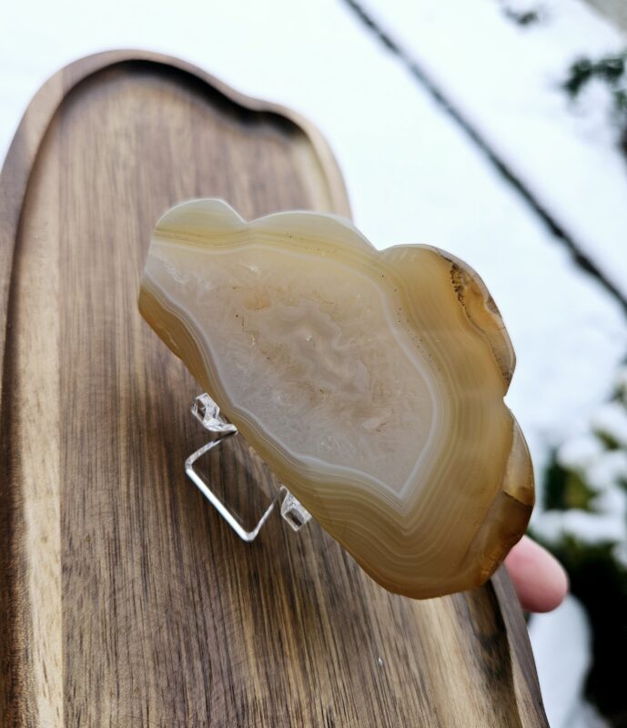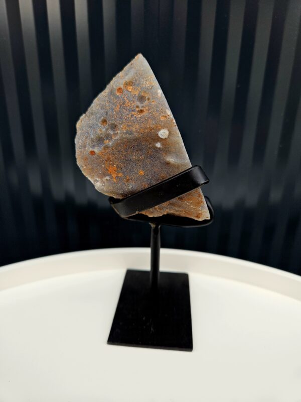 Jemne vrstvený achát v chladných modro-sivých tónoch ukrýva v strede trblietavé kryštálové jadro, ktoré vytvára nádherný kontrast. Minimalistický čierny stojan zvýrazňuje prirodzenú krásu kameňa a dodáva mu moderný, elegantný vzhľad.