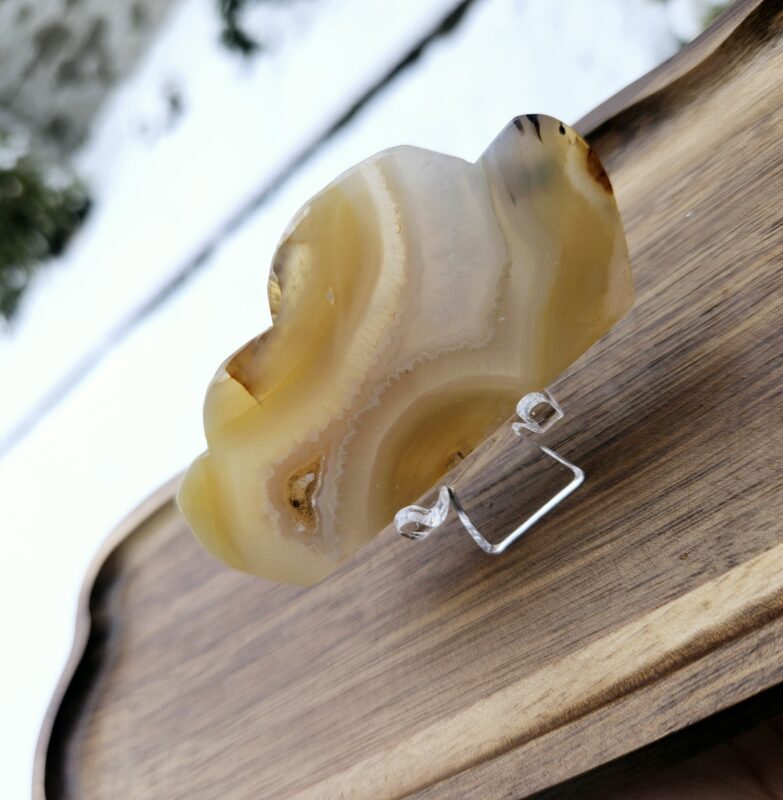 Jemná kresba achátu v svetlých krémových tónoch prechádza do trblietavého kryštálového jadra s teplými hnedými odleskami. Tento výrazný kúsok pôsobí elegantne a prirodzene zároveň – ako malý umelecký detail vytvorený prírodou. Zlatý stojan krásne podčiarkuje jeho jedinečnosť.