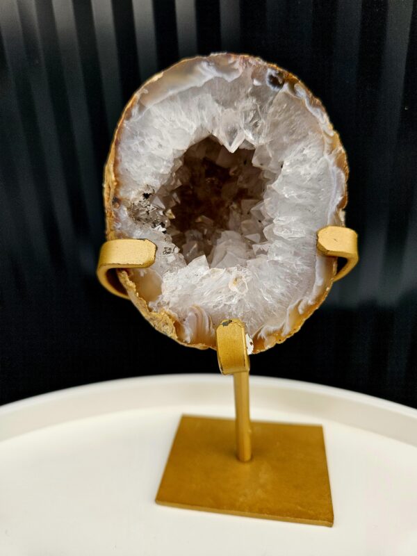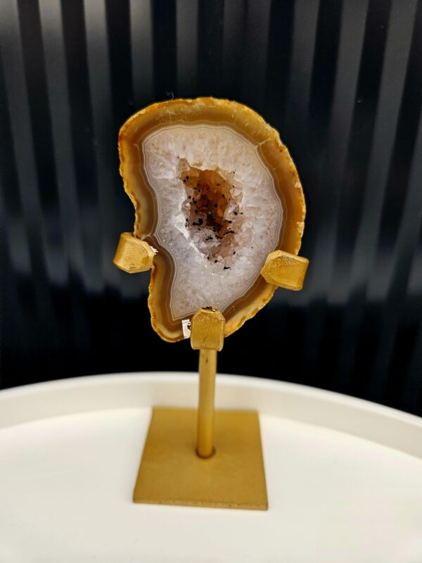 Nádherná achátová geóda s výrazným kryštálovým jadrom v teplých hnedo-medových odtieňoch, ktoré sa jemne lesknú pri dopade svetla. Okolitá svetlá štruktúra vytvára zaujímavý kontrast a dodáva tomuto kúsku hĺbku a charakter. Zlatý stojan podčiarkuje jeho prirodzenú eleganciu.