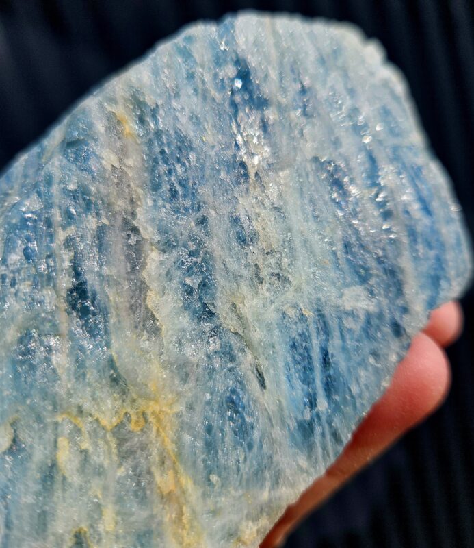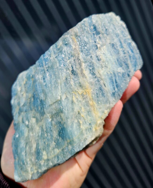 Skutočný zberateľský kúsok. Tento masívny akvamarín zaujme nielen svojou veľkosťou, ale aj nádhernou kryštalickou štruktúrou s výraznými modrými odtieňmi, ktoré pripomínajú zamrznuté morské vlny. Pri dopade svetla sa jeho povrch jemne trblieta a odhaľuje množstvo prírodných detailov.